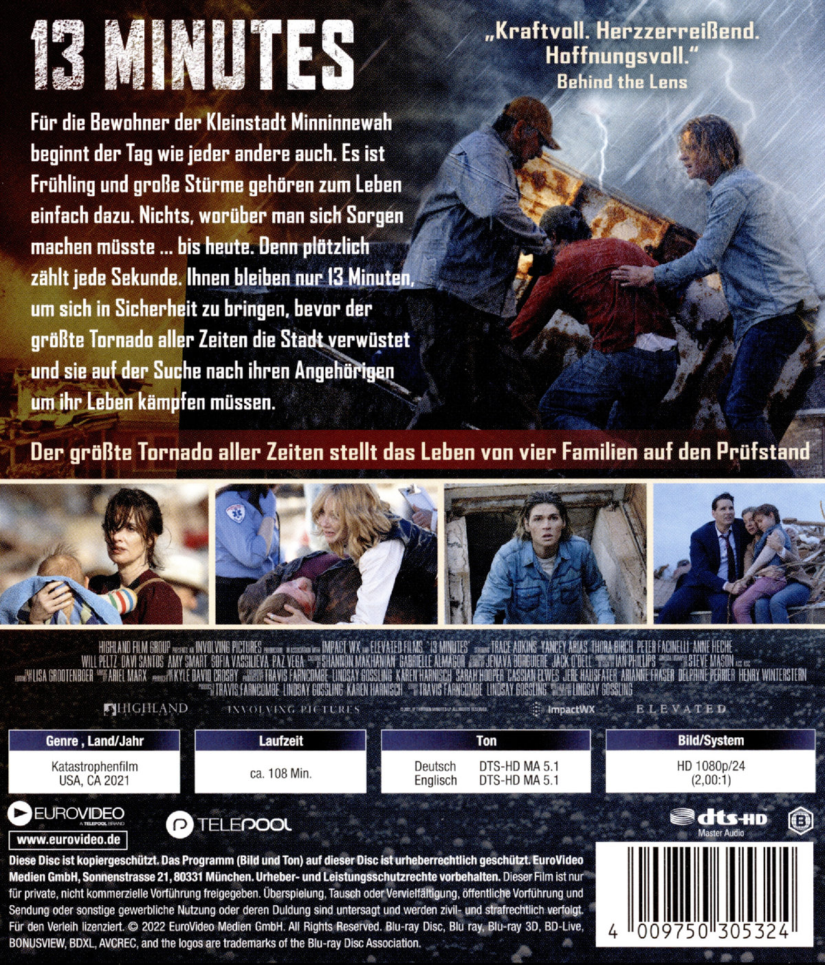 Für die Bewohner der Kleinstadt Minninnewah beginnt der Tag wie jeder andere auch. Es ist Frühling und große Stürme gehören zum Leben einfach dazu. Nichts, worüber man sich Sorgen machen müsste... bis heute. Denn plötzlich zählt jede Sekunde. Ihnen bleiben nur 13 Minuten, um sich in Sicherheit zu bringen, bevor der größte Tornado aller Zeiten die Stadt verwüstet und sie auf der Suche nach ihren Angehörigen um ihr Leben kämpfen müssen.