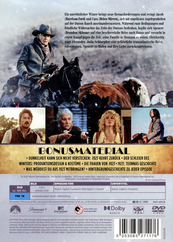 Ein unerbittlicher Winter bringt neue Herausforderungen und zwingt Jacob (Harrison Ford) und Cara (Helen Mirren), sich mit ungelösten Angelegenheiten auf der Dutton Ranch auseinanderzusetzen. Während raue Bedingungen und feindlicheWidersacher das Erbe der Duttons bedrohen, begibt sich Spencer (Brandon Sklenar) auf eine beschwerliche Reise nach Hause und versucht in einem Kampf gegen die Zeit seine Familie in Montana zu retten. Gleichzeitig wagt Alexandra (Julia Schlaepfer) eine gefährliche transatlantische Reise, entschlossen, Spencer zu finden und ihre Liebe zurückzugewinnen.Dieses 3-Disc-Set enthält über zwei Stunden Bonusmaterial, darunter zwei Featurettes mit Interviews von Cast und Crew, beeindruckende Behind-the-Scenes-Aufnahmen sowie detailreiche Einblicke in die Sets, Kostüme und Requisiten, die das Jahr 1923 authentisch zum Leben erwecken.