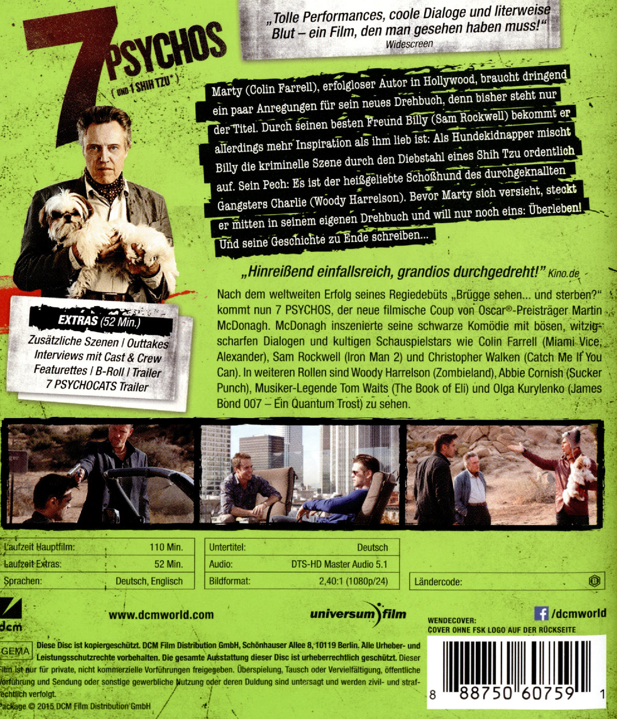 Marty arbeitet an einem Drehbuch. Aber abgesehen von dem Titel "Sieben Psychos" und dem ersten Psycho ist ihm noch nichts eingefallen. Um ihm zu helfen, inseriert sein bester Kumpel, der erfolglose Schauspieler Billy, in einer Zeitung. Um sich über Wasser zu halten, entführt Billy mit dem älteren Hans Hunde und liefert sie wieder bei den Besitzern ab, nachdem sie eine Belohnung ausgeschrieben haben. Dummerweise entführen sie den geliebten Shitzu eines Gangsters. Und mit einem Mal laufen die Psychos Marty die Bude ein.