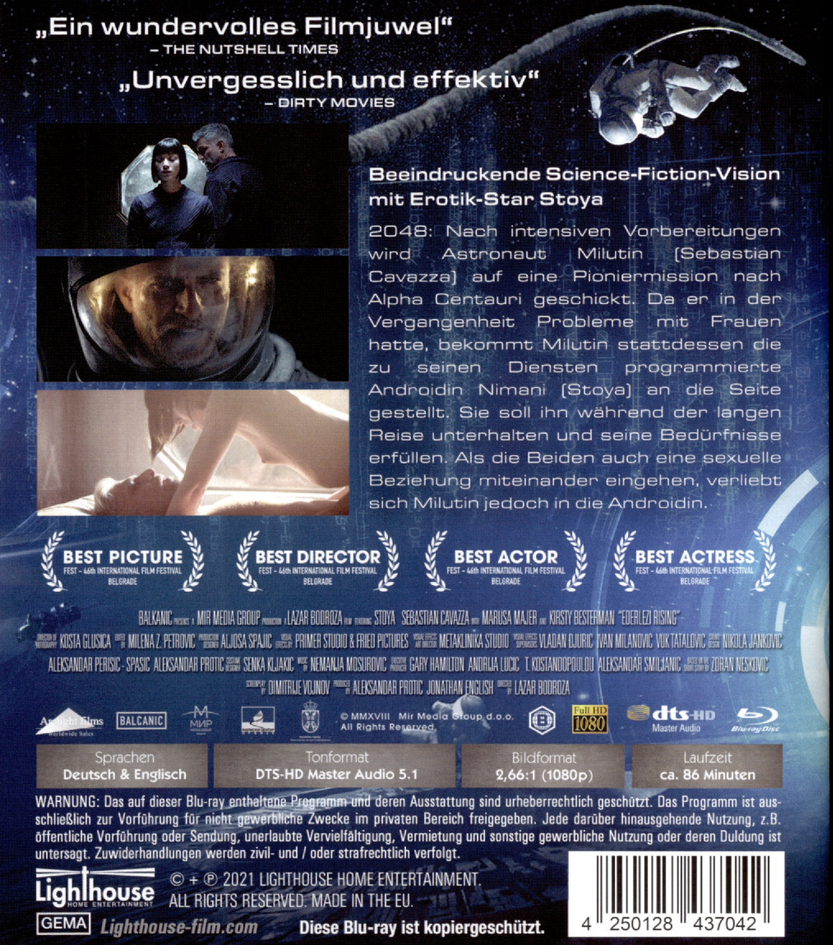 2048: Nach intensiven Vorbereitungen wird Astronaut Milutin auf eine Pioniermission nach Alpha Centauri geschickt. Da er in der Vergangenheit Probleme mit Frauen hatte, bekommt Milutin stattdessen die zu seinen Diensten programmierte Androidin Nimani an die Seite gestellt. Sie soll während der langen Reise seine Bedürfnisse erfüllen. Jedoch scheint sich zwischen beiden mehr anzubahnen …