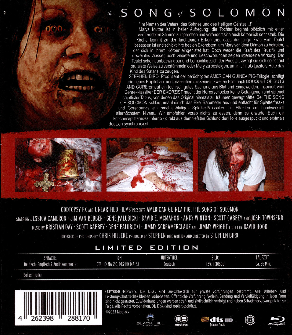 Im Namen des Vaters, des Sohnes und des Heiligen Geistes...!" Marys Mutter ist in heller Aufregung: die Tochter beginnt plötzlich mit einer verfremdeten Stimme zu sprechen und verändert sich auch körperlich sehr stark. Die Kirche kommt zu der furchtbaren Erkenntnis, dass die junge Frau vom Teufel besessen ist und schickt ihre besten Exorzisten, um Mary von dem Dämon zu befreien, der sich in ihrem Körper eingenistet hat. Doch weder die Kraft des Kruzifix und geweihtes Wasser, noch Gebete und Beschwörungen zeigen irgendeine Wirkung. Der Teufel scheint unbezwingbar und bemächtigt sich der Priester, zwingt sie sich selbst auf brutalste Weise zu verstümmeln oder Mary zu besteigen, um mit ihr als Luzifers Hure das Kind des Satans zu zeugen. STEPHEN BIRO, Produzent der berüchtigten AMERICAN GUINEA PIC-Trilogie, schlägt ein neues Kapitel auf und präsentiert mit seinem zweiten Film nach BOUQUET OF GUTS AND GORE erneut ein teuflisch gutes Szenario aus Blut und Eingeweiden. Inspiriert vom Genre-Klassiker DER EXORZIST macht der Horrorschocker keine Gefangenen und sprengt sämtliche Tabus, von denen das Original niemals zu träumen gewagt hätte. Bei THE SONG OF SOLOMON schlägt unaufhörlich das Ekel-Barometer aus und entfacht für Splatterfreaks und Gorehounds ein brachial-blutiges Splatter-Massaker mit Effekten auf handwerklich allerhöchstem Niveau. Wir empfehlen vorab nichts zu essen, denn es erwartet Euch ein knochensplitterndes Inferno - direkt aus dem tiefsten Schlund der Hölle ausgespuckt und erstmals deutsch synchronisiert