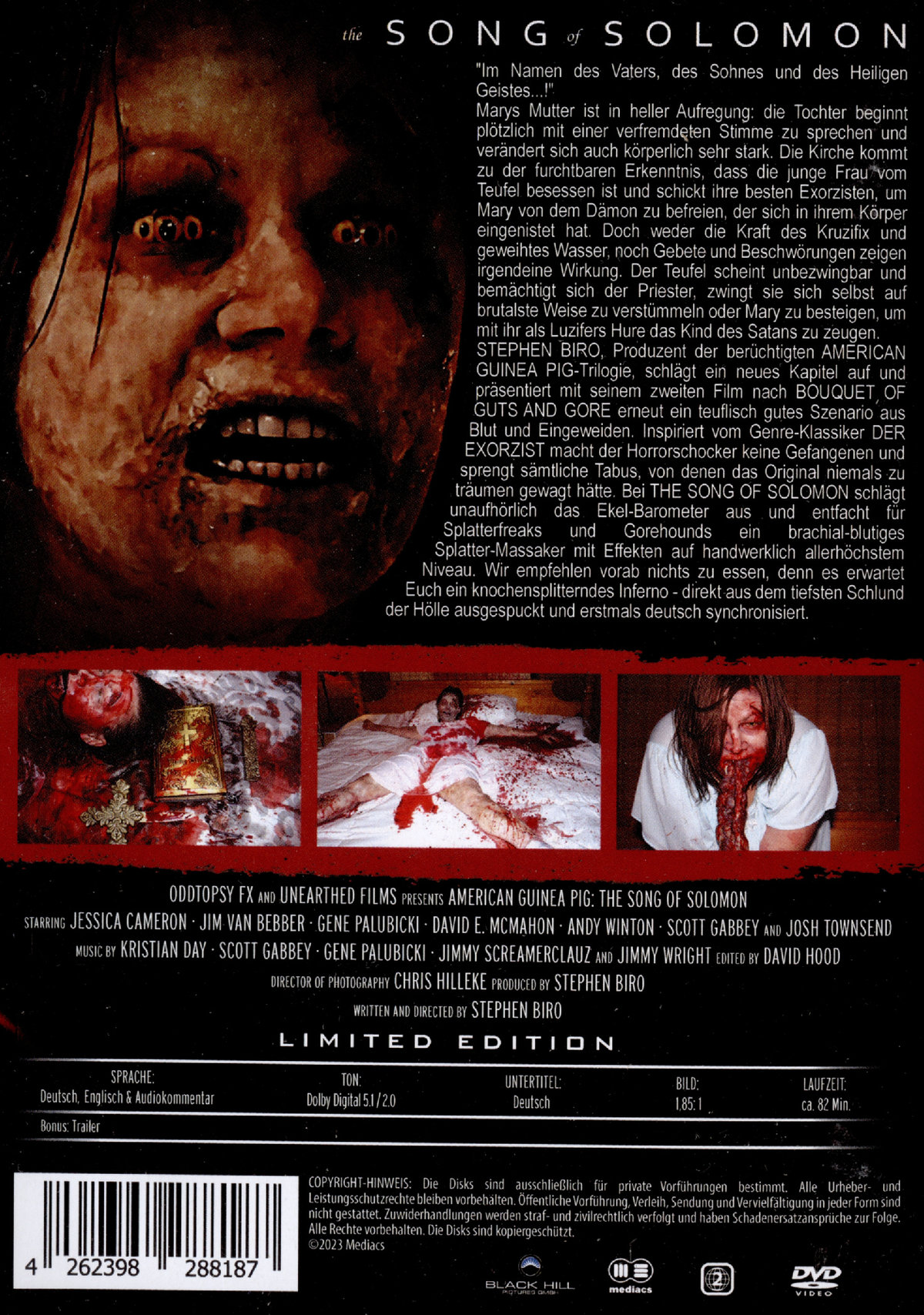 Im Namen des Vaters, des Sohnes und des Heiligen Geistes...!" Marys Mutter ist in heller Aufregung: die Tochter beginnt plötzlich mit einer verfremdeten Stimme zu sprechen und verändert sich auch körperlich sehr stark. Die Kirche kommt zu der furchtbaren Erkenntnis, dass die junge Frau vom Teufel besessen ist und schickt ihre besten Exorzisten, um Mary von dem Dämon zu befreien, der sich in ihrem Körper eingenistet hat. Doch weder die Kraft des Kruzifix und geweihtes Wasser, noch Gebete und Beschwörungen zeigen irgendeine Wirkung. Der Teufel scheint unbezwingbar und bemächtigt sich der Priester, zwingt sie sich selbst auf brutalste Weise zu verstümmeln oder Mary zu besteigen, um mit ihr als Luzifers Hure das Kind des Satans zu zeugen. STEPHEN BIRO, Produzent der berüchtigten AMERICAN GUINEA PIC-Trilogie, schlägt ein neues Kapitel auf und präsentiert mit seinem zweiten Film nach BOUQUET OF GUTS AND GORE erneut ein teuflisch gutes Szenario aus Blut und Eingeweiden. Inspiriert vom Genre-Klassiker DER EXORZIST macht der Horrorschocker keine Gefangenen und sprengt sämtliche Tabus, von denen das Original niemals zu träumen gewagt hätte. Bei THE SONG OF SOLOMON schlägt unaufhörlich das Ekel-Barometer aus und entfacht für Splatterfreaks und Gorehounds ein brachial-blutiges Splatter-Massaker mit Effekten auf handwerklich allerhöchstem Niveau. Wir empfehlen vorab nichts zu essen, denn es erwartet Euch ein knochensplitterndes Inferno - direkt aus dem tiefsten Schlund der Hölle ausgespuckt und erstmals deutsch synchronisiert