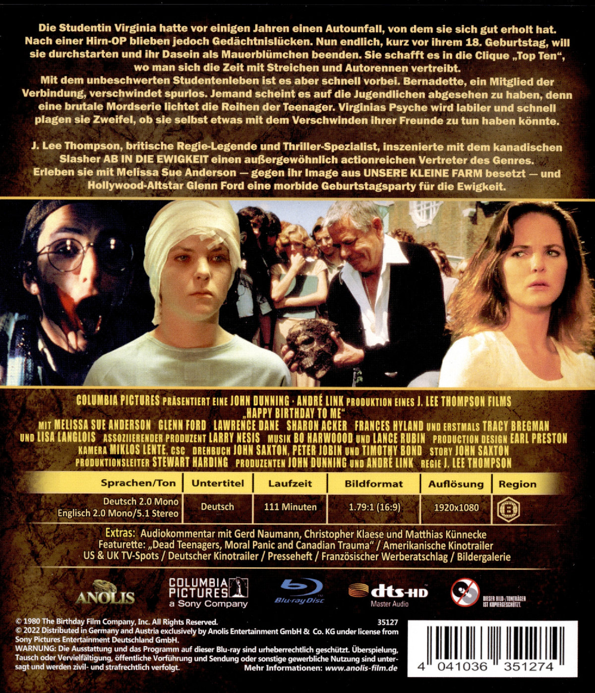 Virginias Psyche wird labiler und schnell plagen sie Zweifel, ob sie selbst etwas mit dem Verschwinden ihrer Freunde zu tun haben könnte.Lee Thompson, britische Regie-Legende und Thriller-Spezialist, inszenierte mit dem kanadischen Slasher AB IN DIE EWIGKEIT einen außergewöhnlich actionreichen Vertreter des Genres. Erleben sie mit Melissa Sue Anderson - gegen ihr Image aus UNSERE KLEINE FARM besetzt - und Hollywood-Altstar Glenn Ford eine morbide Geburtstagsparty für die Ewigkeit.