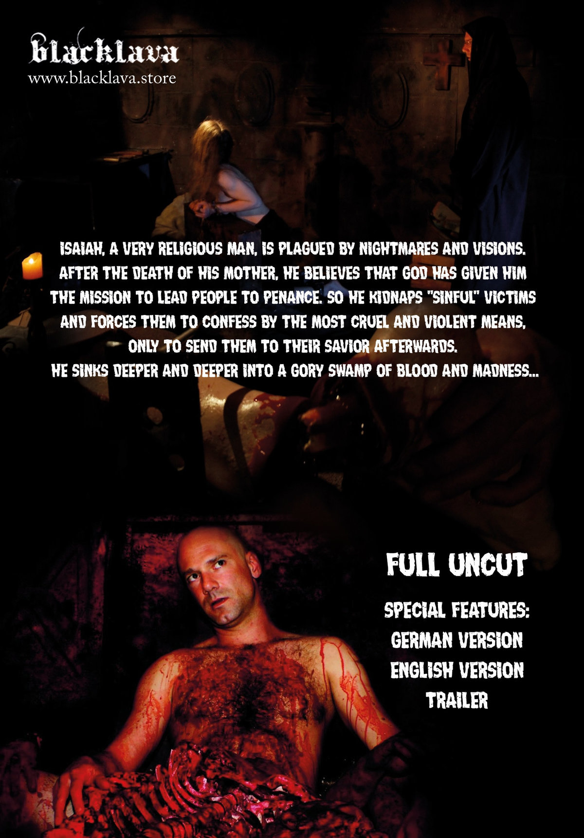 Der strenggläubige Jesaja sieht überall um sich herum Sünde. Als seine Mutter stirbt,f ühlt er sich dazu berufen, zumindest einenTeil der Menschheit von ihrenS ünden zubefreien. Dazu sindi m alle Mittel recht. E rentführt kurzerhand Sünder und zwingt sie zur Beichte, in dem er sie foltert. Erleichtert tötet er dann seine Opfer, wenn si eum Gnade gefleht haben. Jesajas Wahn wird immer größer und er versinkts chon bald in einem wahrgewordenen in einem wahr gewordenen Alptraum aus Blut und Wahnsinn.