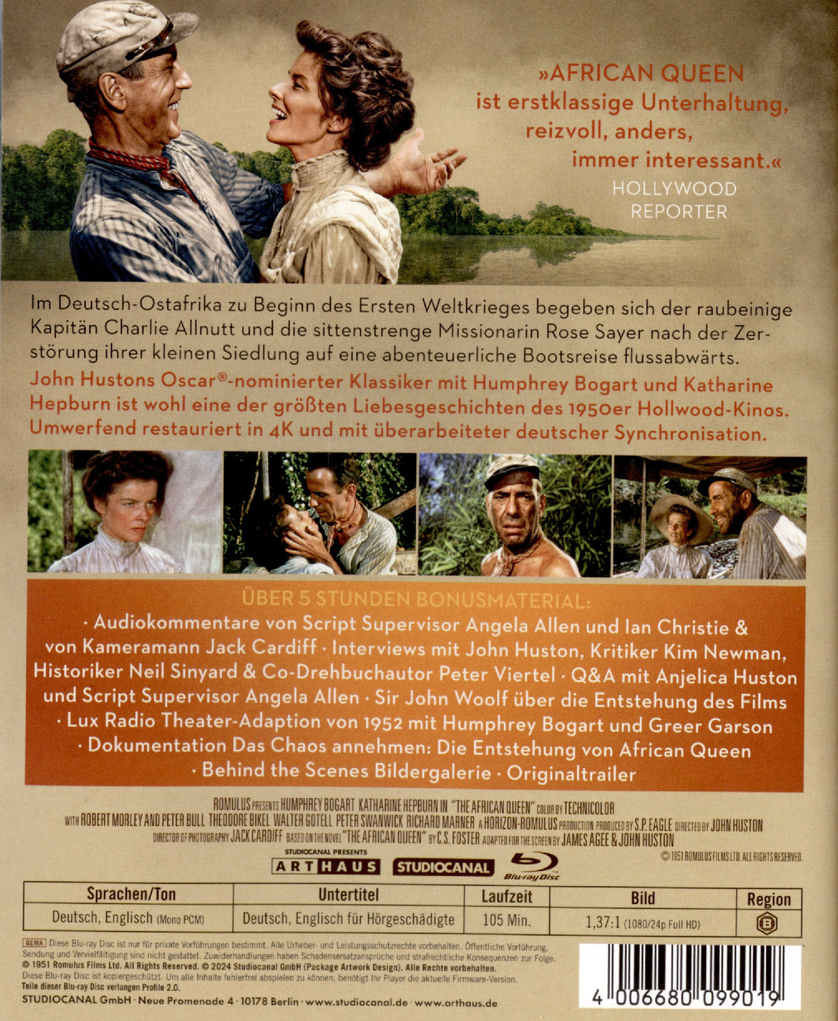 Deutsch-Ostafrika zu Beginn des Ersten Weltkriegs: Bootskapitän Charlie Allnutt (Humphrey Bogart) versorgt mit seinem kleinen Flussdampfer "African Queen" eine Siedlung, in der auch die gottesfürchtige Methodistin Rose Sayer (Katharine Hepburn) mit ihrem Bruder Samuel (Robert Morley) lebt. Nach der überraschenden Zerstörung der Siedlung sieht sich der raubeinige und freiheitsliebende Charlie in der Verantwortung und nimmt die altjüngferliche Rose mit an Bord, die ihm mit ihrer Sittenstrenge sein geliebtes Lotterleben schwermacht. Auf der abenteuerlichen und nicht selten strapaziösen Reise kommt sich das ungleiche Paar allmählich näher - nichtsahnend, dass die härtesten Prüfungen erst noch bevorstehen. John Hustons Literaturverfilmung AFRICAN QUEEN ist wohl eine der schönsten Liebesgeschichten aus dem Hollywood der 1950er Jahre und hat sich als zeitloser Abenteuerfilm-Klassiker in die Filmgeschichte eingeschrieben, der 1952 für vier Oscars® nominiert war, von denen Humphrey Bogart einen als Bester Hauptdarsteller erhielt. "Der Held ist ein Prolet", schilderte Huston die Filmfigur seinem Freund Bogart, "und du bist der größte Prolet der Stadt und daher bestens für die Rolle geeignet." Mit der Besetzung von Katharine Hepburn als perfektem Gegenpart zu Bogart ist Huston ein Geniestreich gelungen, der sich auch an den Kinokassen auszahlte. Als Vorlage für das Drehbuch von John Huston und James Agee diente der gleichnamige Roman von C.S. Forester. Für die Außenaufnahmen begab sich der Regisseur mit den Darstellern und einer 34-köpfigen Crew in die damalige belgische Kolonie Kongo und nach Uganda, wo sich die Dreharbeiten beinahe so aufregend gestalteten wie die Filmhandlung selbst.