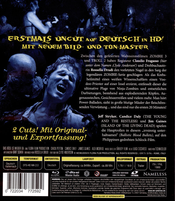 Zwischen den gefeierten Wahnsinnsfilmen ZOMBIE 3 und TROLL 2 haben Regisseur Claudio Fragasso (hier unter dem Namen ‚Clyde Anderson‘) und Drehbuchautorin Rossella Drudi den vorletzten Nagel in den Sarg der legendären ZOMBIE-Serie geschlagen: Als das Krebsheilmittel eines weißen Wissenschaftlers einen Voodoo-Priester auf einer Insel er-zürnt, entfesselt dieser die ultimative Plage von Ninja-Zombies und entsetzlichen Darbietungen, bestehend aus explodierenden Köpfen, Augenausstechen, Gesichtszerreißen und vielem mehr. Man hört Power-Balladen, sieht in große blutige Mäuler der fleischfressenden Verwüstung ... und das sind nur die ersten 20 Minuten!