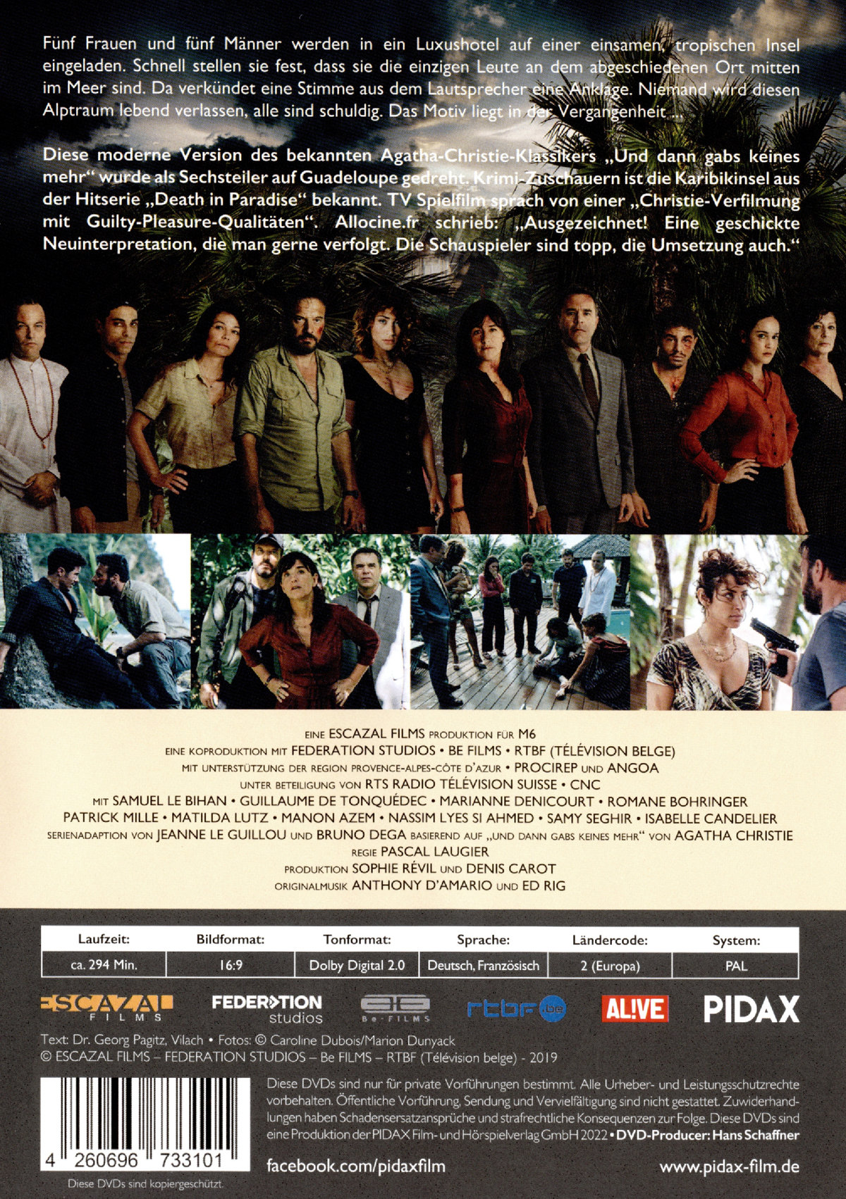 Fünf Frauen und fünf Männer werden in ein Luxushotel auf einer einsamen, tropischen Insel eingeladen. Schnell stellen sie fest, dass sie die einzigen Leute an dem abgeschiedenen Ort mitten im Meer sind. Da verkündet eine Stimme aus dem Lautsprecher eine Anklage. Niemand wird diesen Alptraum lebend verlassen, alle sind schuldig. Das Motiv liegt in der Vergangenheit ... Diese moderne Version des bekannten Agatha-Christie-Klassikers "Und dann gab es keines mehr" wurde als Sechsteiler auf Guadeloupe gedreht. Krimi-Zuschauern ist die Karibikinsel aus der Hitserie "Death in Paradise" bekannt. TV Spielfilm sprach von einer "Christie-Verfilmung mit Guilty-Pleasure-Qualitäten". Allocine.fr schrieb: "Ausgezeichnet! Eine geschickte Neuinterpretation, die man gerne verfolgt. Die Schauspieler sind topp, die Umsetzung auch."