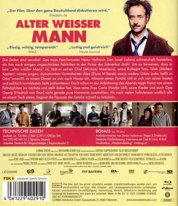 ALTER WEISSER MANN ist die neue Komödie des vielfach ausgezeichneten Filmemachers Simon Verhoeven, die mit viel Humor und Selbstironie auf die großen gesellschaftlichen Themen unserer Zeit. Neben Jan Josef Liefers in der Hauptrolle zählen Nadja Uhl, Friedrich von Thun, Michael Maertens, Meltem Kaptan sowie Elyas M'Barek zum Cast.