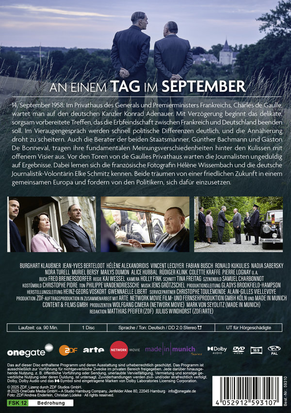 14. September 1958: Im Privathaus des Generals und Premierministers Frankreichs, Charles de Gaulle (Jean-Yves Berteloot), wartet man auf den deutschen Kanzler Konrad Adenauer (Burghart Klaußner). Mit Verzögerung beginnt das delikate, sorgsam vorbereitete Treffen, das die Erbfeindschaft zwischen Frankreich und Deutschland beenden soll. Im Vieraugengespräch werden schnell politische Differenzen deutlich, und die Annäherung droht zu scheitern. Auch die Berater der beiden Staatsmänner, Günther Bachmann (Fabian Busch) und Gaston De Bonneval (Vincent Lecuyer), tragen ihre fundamentalen Meinungsverschiedenheiten hinter den Kulissen mit offenem Visier aus. Vor den Toren von de Gaulles Privathaus warten die Journalisten ungeduldig auf Ergebnisse. Dabei lernen sich die französische Fotografin Hélène Wissembach (Nora Turell) und die deutsche Journalistik-Volontärin Elke Schmitz (Nadja Sabersky) kennen. Beide träumen von einer friedlichen Zukunft in einem gemeinsamen Europa und fordern von den Politikern, sich dafür einzusetzen.