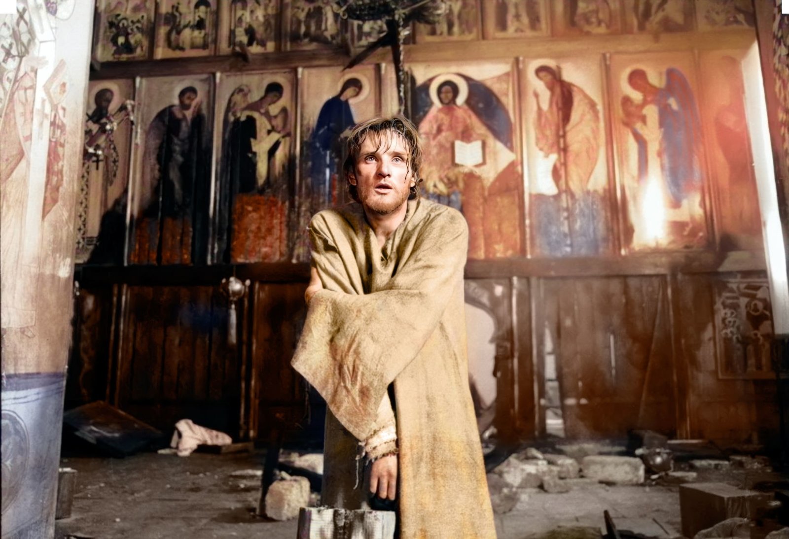 In acht Episoden, vom Jahr 1400 bis 1423, schildert Andrej Tarkowskij die Lebensgeschichte des altrussischen Ikonenmalers Andrej Rubljow, der Zeuge der kompromisslosen Macht- und Kriegspolitik seiner Auftraggeber wird. Selbstvorwürfe stürzen ihn in eine tiefe Schaffenskrise, bis er neuen künstlerischen Mut schöpft und sein Schweigegelübde bricht. In der UdSSR seinerzeit erst Jahre nach seiner Fertigstellung und mehreren Schnittfassungen aufgeführt: "Der schwarzweiße Film, der lediglich in seinen Schlussszenen, in denen er Ikonen Rubljows zeigt, farbig wird, ist meisterhaft gestaltet. Szenen von visionärer Kraft und Vitalität werden unterbrochen von philosophischen Exkursen; formale Akzente wie Zwischentitel, Zeitlupenaufnahmen und Standbilder sind raffiniert eingesetzt. Der episch breite Bericht aus einer Zeit voller Gewalttaten und Hass kreist immer wieder um das Problem des Künstlers, der ein Werkzeug in der Hand der Mächtigen und der Ideologen ist." (RECLAMS FILMFÜHRER)