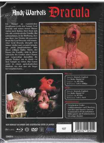| Zus.Info | - RePack: cmv - Auf 222 Stück limitiertes und wattierttes Mediabook - 44-seitiges Booklet mit vielen seltenen Fotos und einem Text von Mike Blankenburg - Original Trailer - Audiokommentar vom Paul Morrisey, Udo Kier und Maurice Yacowar - Probeaufnahmen (kommentiert von Paul Morrisey) - Bildergalerie mit Produktionsfotos (kommentiert von Paul Morrisey) - Trailer zu ANDY WARHOLS FRANKENSTEIN, DIE ZÄRTLICHKEIT DER WÖLFE und DER SCHWARZE LEIB DER TARANTEL - Animierte interaktive Menus - DVD-Version |