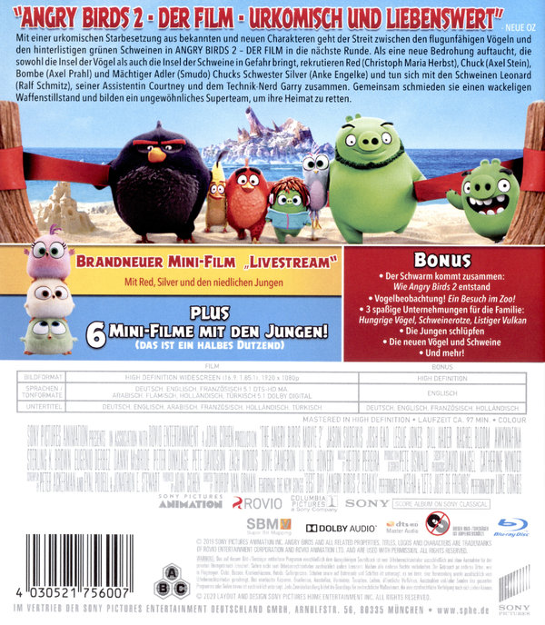 Mit einer urkomischen Starbesetzung aus bekannten und neuen Charakteren geht der Streit zwischen den flugunfähigen Vögeln und den hinterlistigen grünen Schweinen in ANGRY BIRDS 2 – DER FILM in die nächste Runde. Als eine neue Bedrohung auftaucht, die sowohl die Insel der Vögel als auch die Insel der Schweine in Gefahr bringt, rekrutieren Red (Christoph Maria Herbst), Chuck (Axel Stein), Bombe (Axel Prahl) und Mächtiger Adler (Smudo) Chucks Schwester Silver (Anke Engelke) und tun sich mit den Schweinen Leonard (Ralf Schmitz), seiner Assistentin Courtney und dem TechnikNerd Garry zusammen. Gemeinsam schmieden sie einen wackeligen Waffenstillstand und bilden ein ungewöhnliches Superteam, um ihre Heimat zu retten.