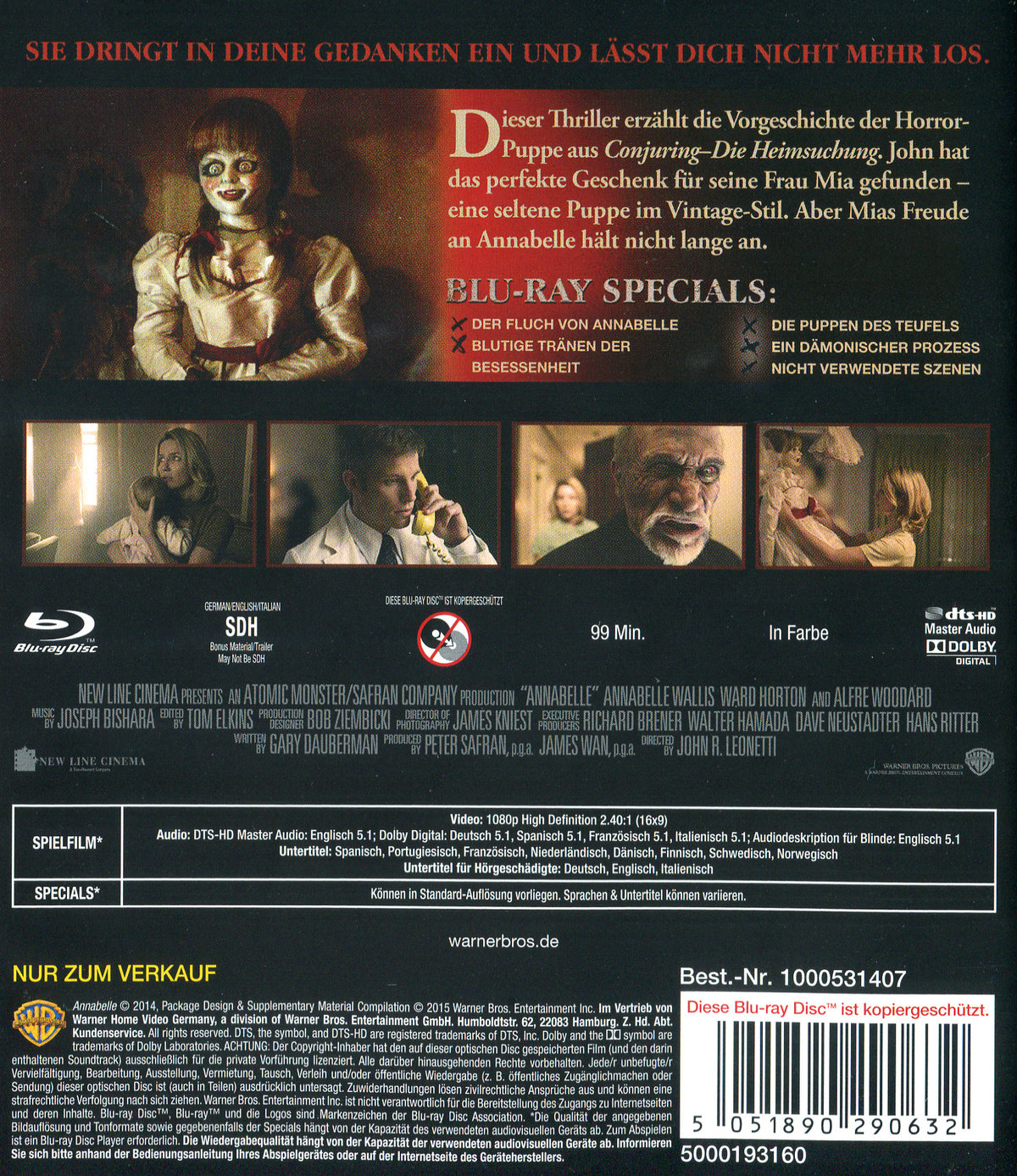 Das Spin-Off zum erfolgreichen Schocker ?Conjuring ? Die Heimsuchung? erzählt die Vorgeschichte der Horror-Puppe, die das Blut in den Adern gefrieren lässt. Die Puppe verfügt über unheimliche Mächte und existiert auch in Wahrheit. Sie wird in einem Museum unter Verschluss gehalten ? ihr einziger Besucher ist ein Geistlicher, der sie alle zwei Wochen segnet. Vergebens ? in "Annabelle" entwickelt die Puppe ein brutales Eigenleben. John Form hat das perfekte Geschenk für seine schwangere Frau Mia gefunden ? eine schöne, seltene Puppe im Vintage-Stil, bekleidet mit einem schneeweißen Hochzeitskleid. Aber Mias Freude an Annabelle hält nicht lange an. In einer schrecklichen Nacht dringen Mitglieder eines satanischen Kultes in ihr Haus ein und greifen das Paar an. Terror und Blutspritzer sind nicht das einzige, das sie zurücklassen. Die Satanisten beschwören ein Wesen, das so viel bösartiger ist als alles, was sie selbst tun und das sich ein teuflisches Medium sucht ? Annabelle.