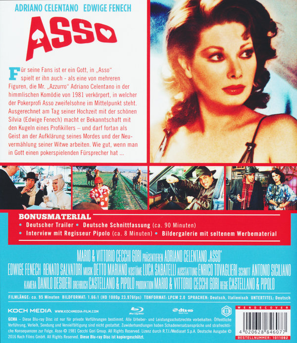Für seine Fans ist er ein Gott - in "Asso" spielt er ihn auch: Adriano Celentano! Im Mittelpunkt dieser himmlischen Komödie von 1981 steht der ebenfalls vom italienischen Superstar verkörperte Pokerprofi Asso. Dieser macht ausgerechnet am Tag seiner Hochzeit mit der schönen Silvia (Edwige Fenech) Bekanntschaft mit den Kugeln eines Profikillers - und darf fortan als Geist an der Aufklärung seiner Ermordung und der Neuvermählung seiner Witwe arbeiten. Wie gut, wenn man auch noch in Gott einen pokerspielenden Fürsprecher hat...