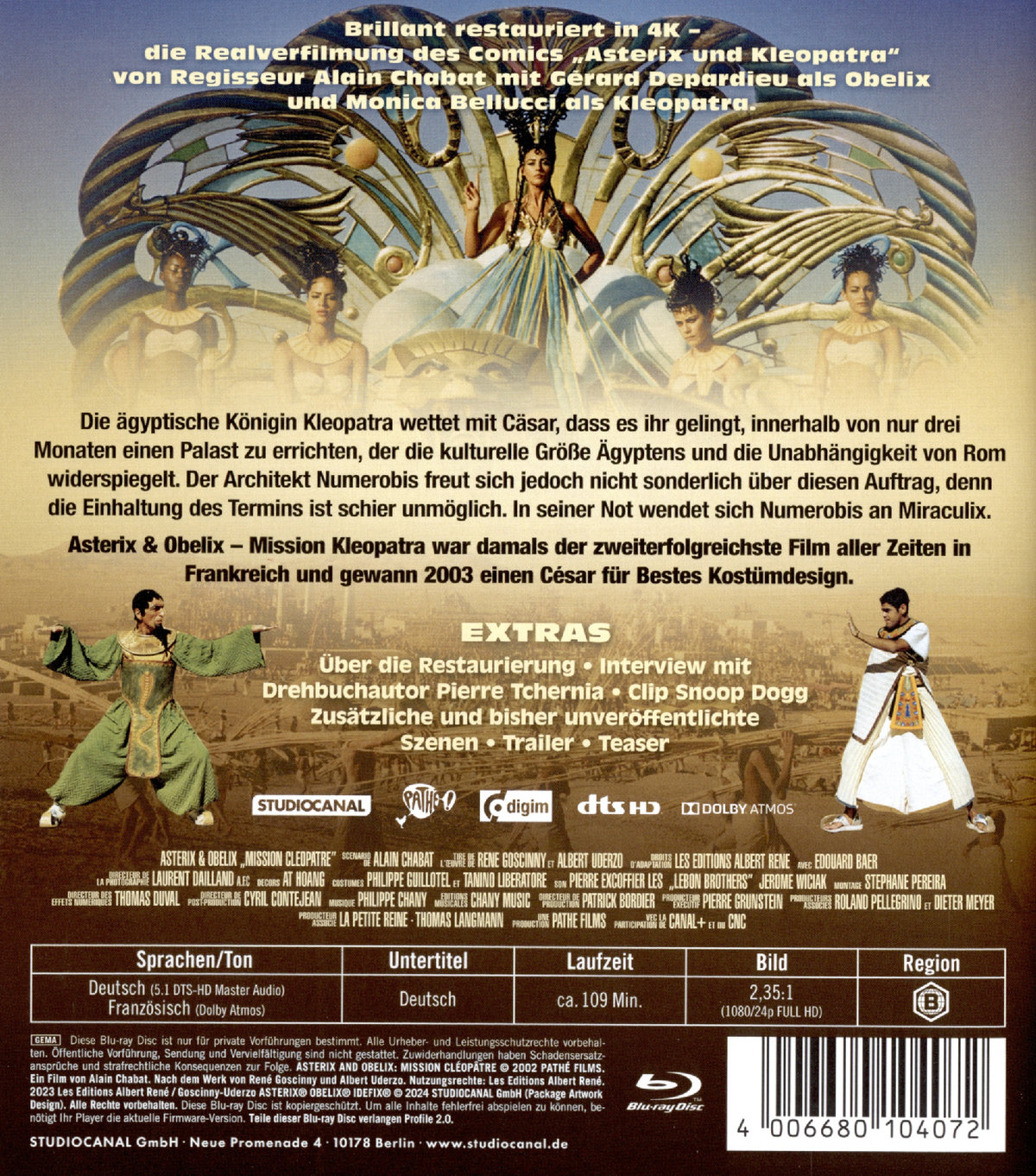 Die Realverfilmung des Comics "Asterix und Kleopatra" von dem französischen Regisseurs Alain Chabat. Mit dem OSCAR® nominierten französischen Schauspieler Gérard Depardieu als Obelix und Monica Bellucci als Kleopatra. Der Film gewann 2003 den César Awards für Best Costume Design und war damals der zweiterfolgreichste Film aller Zeiten in Frankreich.