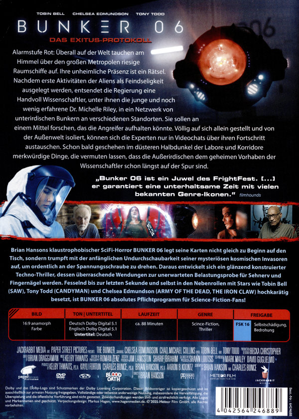 Alarmstufe Rot: Überall auf der Welt tauchen am Himmel über den großen Metropolen riesige Raumschiffe auf. Ihre unheimliche Präsenz ist ein Rätsel. Nachdem erste Aktivitäten der Aliens als Feindseligkeit ausgelegt werden, entsendet die Regierung eine Handvoll Wissenschaftler, unter ihnen die junge und noch wenig erfahrene Dr. Michelle Riley, in ein Netzwerk von unterirdischen Bunkern an verschiedenen Standorten. Sie sollen an einem Mittel forschen, das die Angreifer aufhalten könnte. Völlig auf sich allein gestellt und von der Außenwelt isoliert, können sich die Experten nur in Videochats über ihren Fortschritt austauschen. Schon bald geschehen im düsteren Halbdunkel der Labore und Korridore merkwürdige Dinge, die vermuten lassen, dass die Außerirdischen dem geheimen Vorhaben der Wissenschaftler schon längst auf der Spur sind. Brian Hansons klaustrophobischer SciFi-Horror THE BUNKER legt seine Karten nicht gleich zu Beginn auf den Tisch, sondern trumpft mit der anfänglichen Undurchschaubarkeit seiner mysteriösen kosmischen Invasoren auf, um ordentlich an der Spannungsschraube zu drehen. Daraus entwickelt sich ein glänzend konstruierter Techno-Thriller, dessen überraschende Wendungen zur unerwarteten Belastungsprobe für Sehnerv und Fingernägel werden. Fesselnd bis zur letzten Sekunde und selbst in den Nebenrollen mit Stars wie Tobin Bell (SAW), Tony Todd (CANDYMAN) und Chelsea Edmundson (ARMY OF THE DEAD, THE IRON CLAW) hochkarätig besetzt, ist THE BUNKER absolutes Pflichtprogramm für Science-Fiction-Fans!
