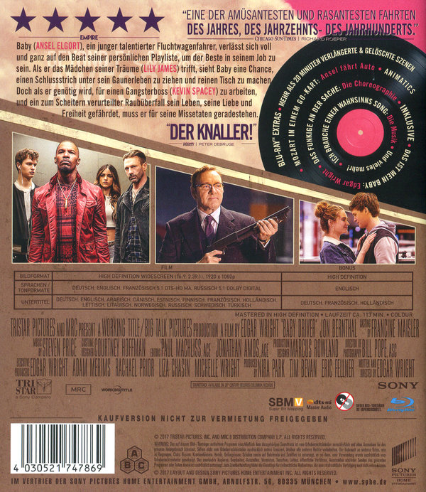Nach einem Autodiebstahl ist der junge, waghalsige Baby gezwungen für einen skrupellosen Gangster-Boss als Fluchtwagenfahrer zu arbeiten. Ehe er sich versieht, ist er in eine Reihe irrwitziger Raubüberfälle verwickelt – und verantwortlich dafür, dass die Gangster davonkommen. Er rast durch die Straßen von Atlanta, als gäbe es kein Morgen mehr – aber nur, wenn der Sound stimmt. Passend zu jeder Lebenslage und allzeit verfügbar als Knopf im Ohr.