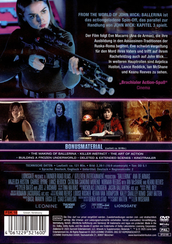 In FROM THE WORLD OF JOHN WICK: BALLERINA schwört Ana de Armas alias Eve Macarro Vergeltung für den Mord an ihrer Familie. Der Film, der während der Ereignisse von „John Wick: Kapitel 3“ spielt, folgt der jungen Rächerin, die bei den berüchtigten Ruska-Roma ihre Ausbildung in der Kunst des Tötens beginnt.