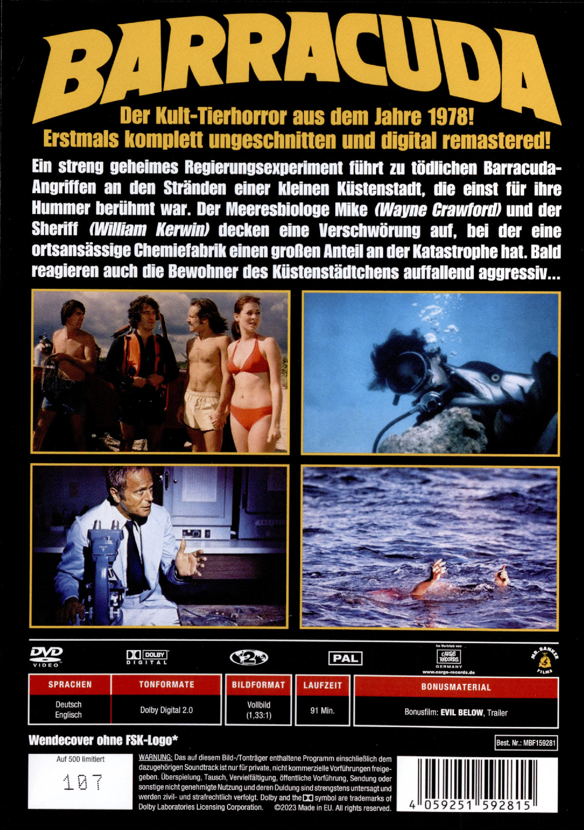 Eine grauenvolle Todesszenerie versetzt die Bürger einer friedlichen USA-Küstenstadt in Angst und Schrecken. Stichwort des täglichen Horrors: BARRACUDA. Verblutete Menschenköpfe als Strandgut, bis zur Unkenntlichkeit zerfetzte Taucher - das sind grausame Zeugen einer mörderischen Aggressivität der sonst so friedfertigen Fische. BARRACUDA - ein Film, der tief schockiert und morgen schon brutale Wirklichkeit werden kann.