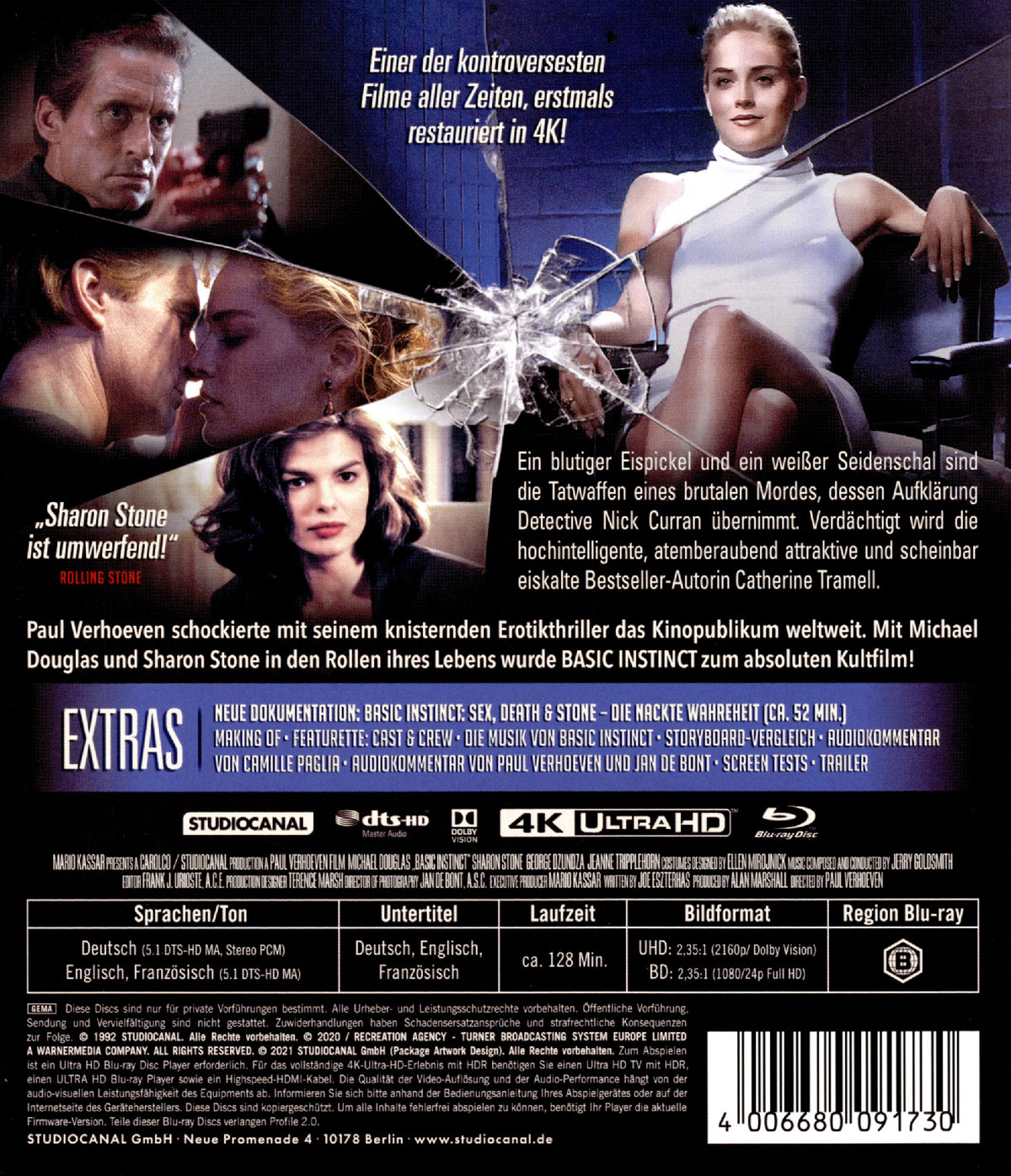 Basic Instinct: Sex, Death & Stone – Die nackte Wahrheit; Blondes Gift - Making of; Featurette: Cast & Crew; Die Musik von Basic Instinct; Storyboard-Vergleich; Audiokommentar von Camille Paglia; Audiokommentar von Paul Verhoeven und Jan de Bont, Screen Tests; Trailer;