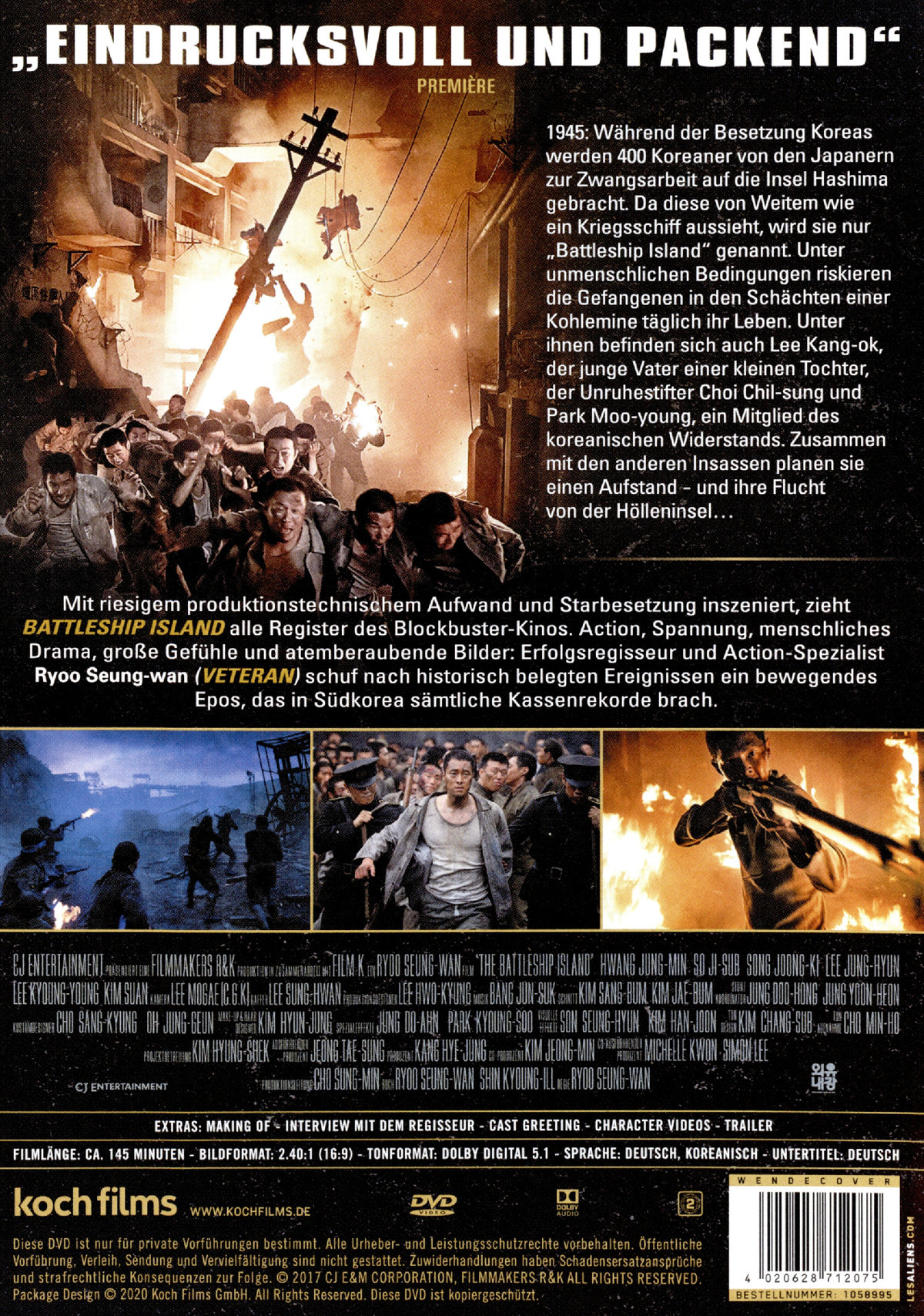 Mit hohem produktionstechnischen Aufwand und Starbesetzung inszeniert, zieht BATTLESHIP ISLAND alle Register des Blockbuster-Kinos. Erfolgsregisseur und Action-Spezialist Ryoo Seung-wan (VETERAN) schuf nach historisch belegten Ereignissen einen Festival-Liebling, der in Südkorea sämtliche Kassenrekorde brach.