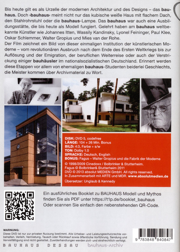 Bis heute gilt es als Urzelle der modernen Architektur und des Designs - das Bauhaus. Doch "Bauhaus" meint nicht nur das kubische weiße Haus mit flachem Dach, den Stahlrohrstuhl oder die Bauhaus-Lampe. Das Bauhaus war auch eine Ausbildungsstätte, die bis heute als Modell fungiert. Gelehrt haben dort weltbekannte Künstler von Johannes Itten, Wassily Kandinsky über Lyonel Feininger, Paul Klee, Oskar Schlemmer und Walter Gropius bis Mies van der Rohe. Der Film zeichnet ein Bild dieser einmaligen Institution der künstlerischen Moderne - vom revolutionären Ausbruch nach dem Ende des Ersten Weltkriegs bis zur Auflösung und Emigration, der beruflichen Weiterreise oder auch der Verstrickung einiger Bauhäusler im nationalsozialistischen Deutschland. Erinnert werden diese Etappen vor allem von einigen ehemaligen Bauhaus-Studenten beiderlei Geschlechts, die Meister kommen über Archivmaterial zu Wort. Diese wohl umfassendste kritische Darstellung der künstlerischen und politischen Ziele des Bauhauses in einem Filmporträt gibt Einblick in die Essenz der Bauhaus-Prinzipien, die Konflikte, die zur Verlegung des Bauhauses von Weimar nach Dessau führten, die Auflösung der Schule in der Nazi-Zeit, die Bautätigkeit im jungen Staat Israel und in Entstehung des Mythos vom "Bauhaus" in den USA.