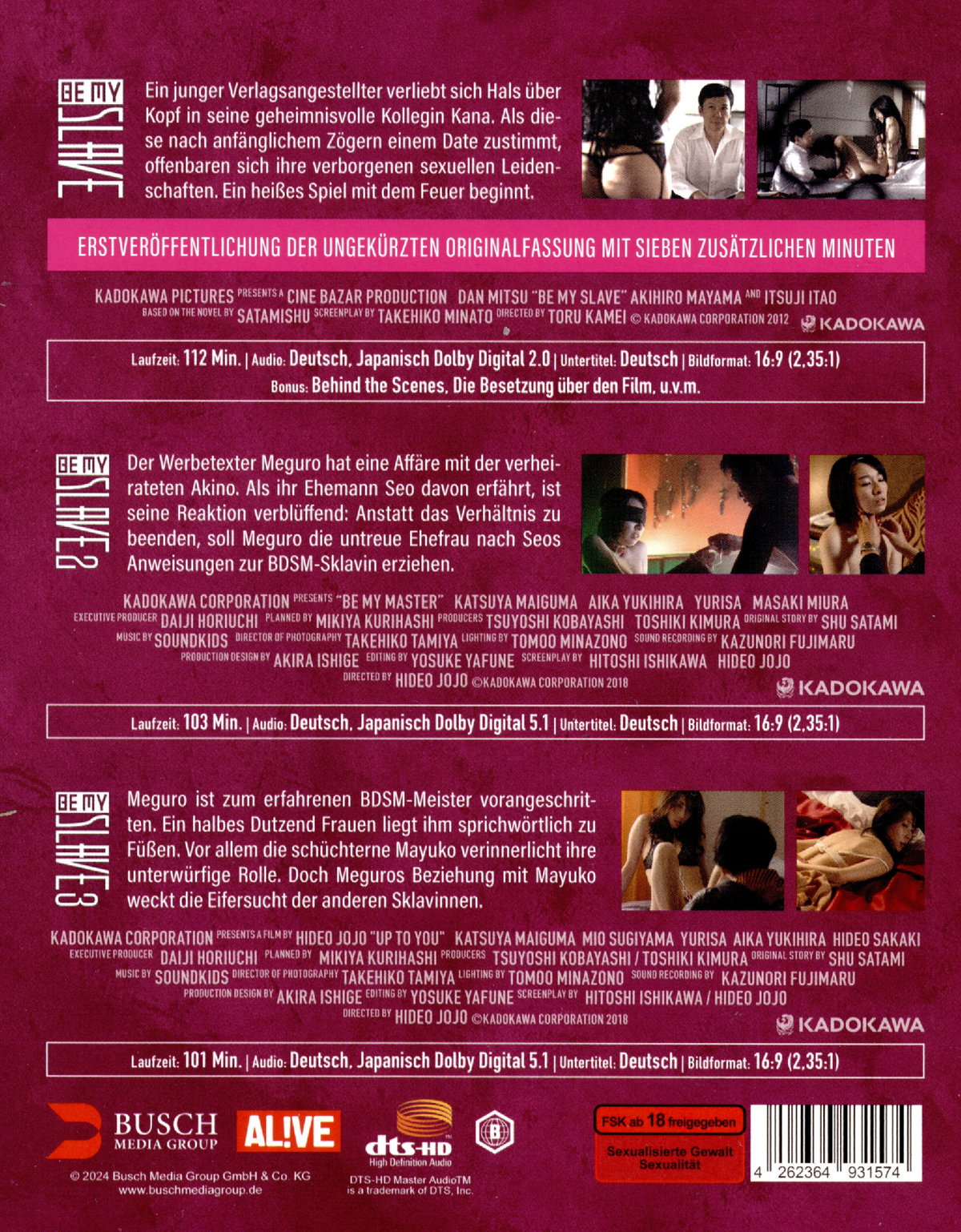 Die Sammler-Edition der tabubrechenden japanischen Erotik-Trilogie, nach dem skandalösen BDSM-Roman von Shu Satami. Highlight ist der moderne Klassiker BE MY SLAVE – IM BANN DER BEGIERDE, der hier erstmals in der ungekürzten Fassung erhältlich ist und mehr als sieben zusätzliche Minuten der heißesten Szenen bietet. Darüber hinaus enthält die Box die beiden Fortsetzungen BE MY SLAVE 2 und BE MY SLAVE 3 in deutscher Erstveröffentlichung. Sprichwörtlich fesselndes erotisches Entertainment auf höchstem Niveau! BE MY SLAVE – IM BANN DER BEGIERDE (Uncut) Ein Verlagsangestellter verliebt sich Hals über Kopf in seine geheimnisvolle Kollegin Kana. Nach mehreren gescheiterten Annäherungsversuchen lädt diese ihn plötzlich zu sich nach Hause ein. Dort wird er Zeuge von Kanas verborgenen Leidenschaften, an denen er bald schon selbst teilhaben wird. Ein heißes Spiel mit dem Feuer! BE MY SLAVE 2 Der Werbetexter Meguro hat eine Affäre mit der verheirateten Akino. Als ihr Ehemann Seo davon erfährt, ist seine Reaktion verblüffend: Anstatt das Verhältnis zu beenden, soll Meguro die untreue Ehefrau nach Seos Anweisungen zur BDSM-Sklavin erziehen. Doch das anfangs reizvolle Spiel eskaliert bedenklich. BE MY SLAVE 3 Das fesselnde Finale der hocherotischen BE-MY-SLAVE-Trilogie. Meguro ist zum erfahrenen BDSM-Meister vorangeschritten. Ein halbes Dutzend Frauen liegt ihm sprichwörtlich zu Füßen. Vor allem die schüchterne Mayuko verinnerlicht schnell ihre unterwürfige Rolle. Doch Meguros Beziehung mit Mayuko weckt bei den anderen Sklavinnen Eifersucht und Rachegelüste.