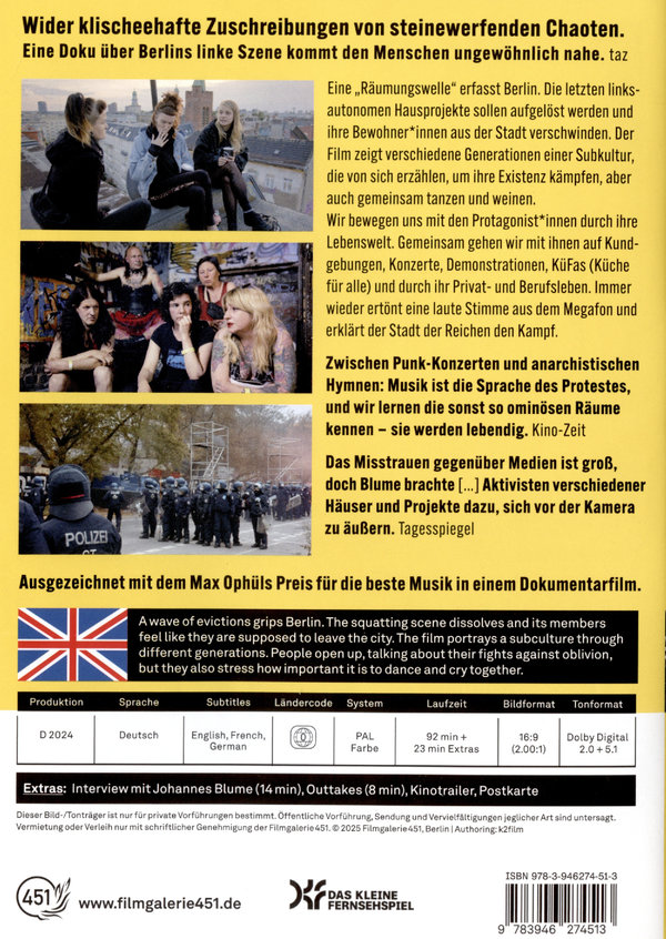 Eine „Räumungswelle" erfasst Berlin. Die letzten linksautonomen Hausprojekte sollen aufgelöst werden und ihre Bewohner*innen aus der Stadt verschwinden. Der Film zeigt verschiedene Generationen einer Subkultur, die von sich erzählen, um ihre Existenz kämpfen, aber auch gemeinsam tanzen und weinen. Wir bewegen uns mit den Protagonist*innen durch ihre Lebenswelt. Gemeinsam gehen wir mit ihnen auf Kundgebungen, Konzerte, Demonstrationen, KüFas (Küche für alle) und durch ihr Privat- und Berufsleben. Immer wieder ertönt eine laute Stimme aus dem Megafon und erklärt der Stadt der Reichen den Kampf.