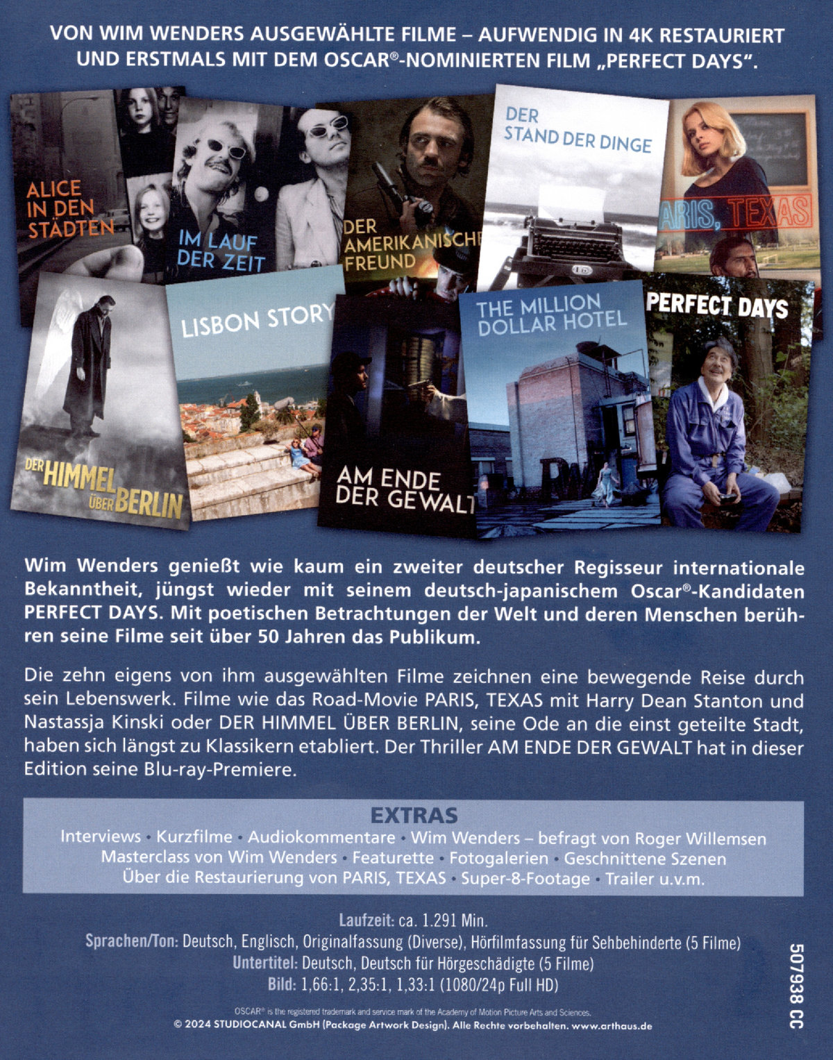 Wim Wenders genießt wie kaum ein zweiter deutscher Regisseur internationale Bekanntheit, jüngst wieder mit seinem deutsch-japanischem Oscar-Kandidat PERFECT DAYS. Mit poetischen Betrachtungen der Welt und deren Menschen berühren seine Filme seit über 50 Jahren das Publikum. Die zehn eigens von ihm ausgewählten Filme zeichnen eine bewegende Reise durch sein Lebenswerk. Filme wie das Road-Movie PARIS, TEXAS mit Harry Dean Stanton und Nastassja Kinski oder DER HIMMEL ÜBER BERLIN, seine Ode an die einst geteilte Stadt, haben sich bereits zu Klassikern etabliert. Der Thriller AM ENDE DER GEWALT hat in dieser Box seine Blu-ray-Premiere. (10 DVDs) EXTRAS: Interviews, Kurzfilme, Audiokommentare, Wim Wenders – befragt von Roger Willemsen, Masterclass von Wim Wenders, Featurette, Fotogalerien, Geschnittene Szenen, Über die Restaurierung von „Paris, Texas“, Super-8-Footage, Trailer u.v.m. FILME: Alice in den Städten Im Lauf der Zeit Der amerikanische Freund Der Stand der Dinge Paris, Texas Der Himmel über Berlin Lisbon Story Am Ende der Gewalt The Million Dollar Hotel Perfect Days
