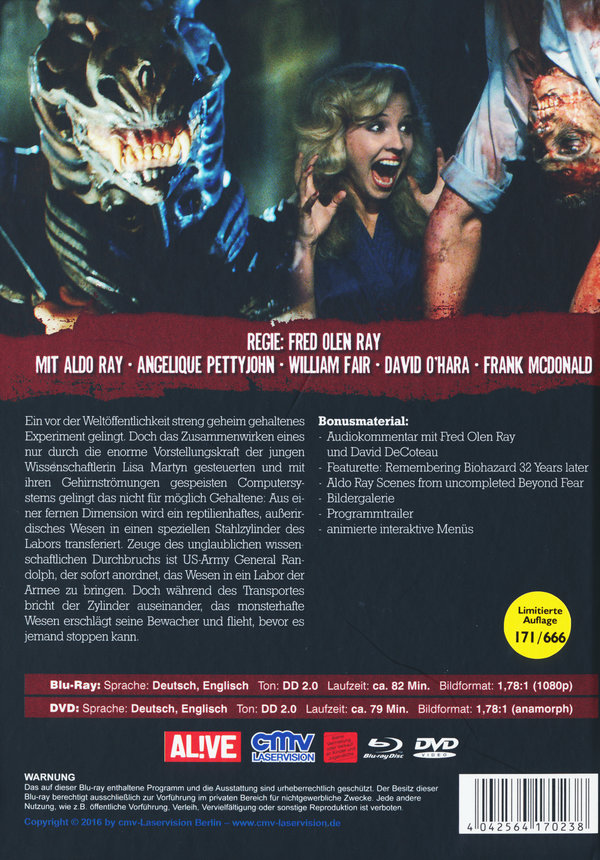 Audiokommentar;Featurette: Remembering Biohazard 32 Years later;Aldo Ray Scenes from uncompleted Beyond Fear;Bildergalerie;Programmtrailer;