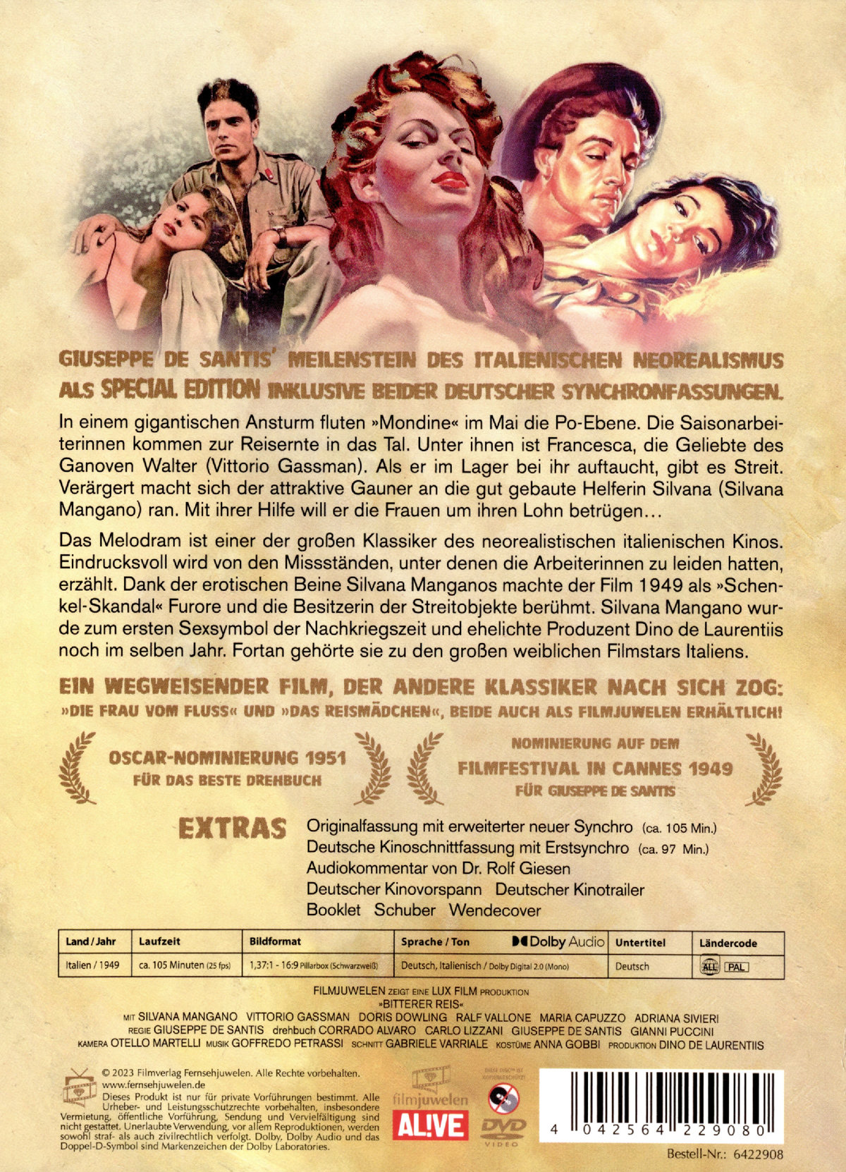 Interview mit Drehbuchautor Carlo Lizzani (OmU / 6:36 Min.); Guido Michelone über den Film (OmU / 6:36 Min.); Regisseur Giuseppe De Santis berichtet (OmU / 32 Min.); Comic ›Bitterer Reis‹ (OmU / 4 Min.); Originaltrailer; Deutscher Trailer; Bildergalerie; Archivmaterial; Booklet mit Hintergrundinformationen und Biographien;Wendecover;