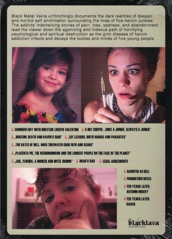 The Uncut an Uncensored Director s Version of Black Metal Veins unflinchingly documents the dark realities of despair and morbid self anihilation surrounding the lives of five heroin junkies. The addicts intertwining stories of pain, loss, sadness, and abandonment lead the viewer down the agonizing and hideous path of horrifying psychological and spiritual destruction as the grim desease of heroin addiction infects and decays the bodies and minds of five young people. Black Metal Veins allows us to stare the haunted void of personal doom af a junkie, as we see five lives unravel before us, and the devastating transformation brought forth by the Hellish grip of drug addiction..