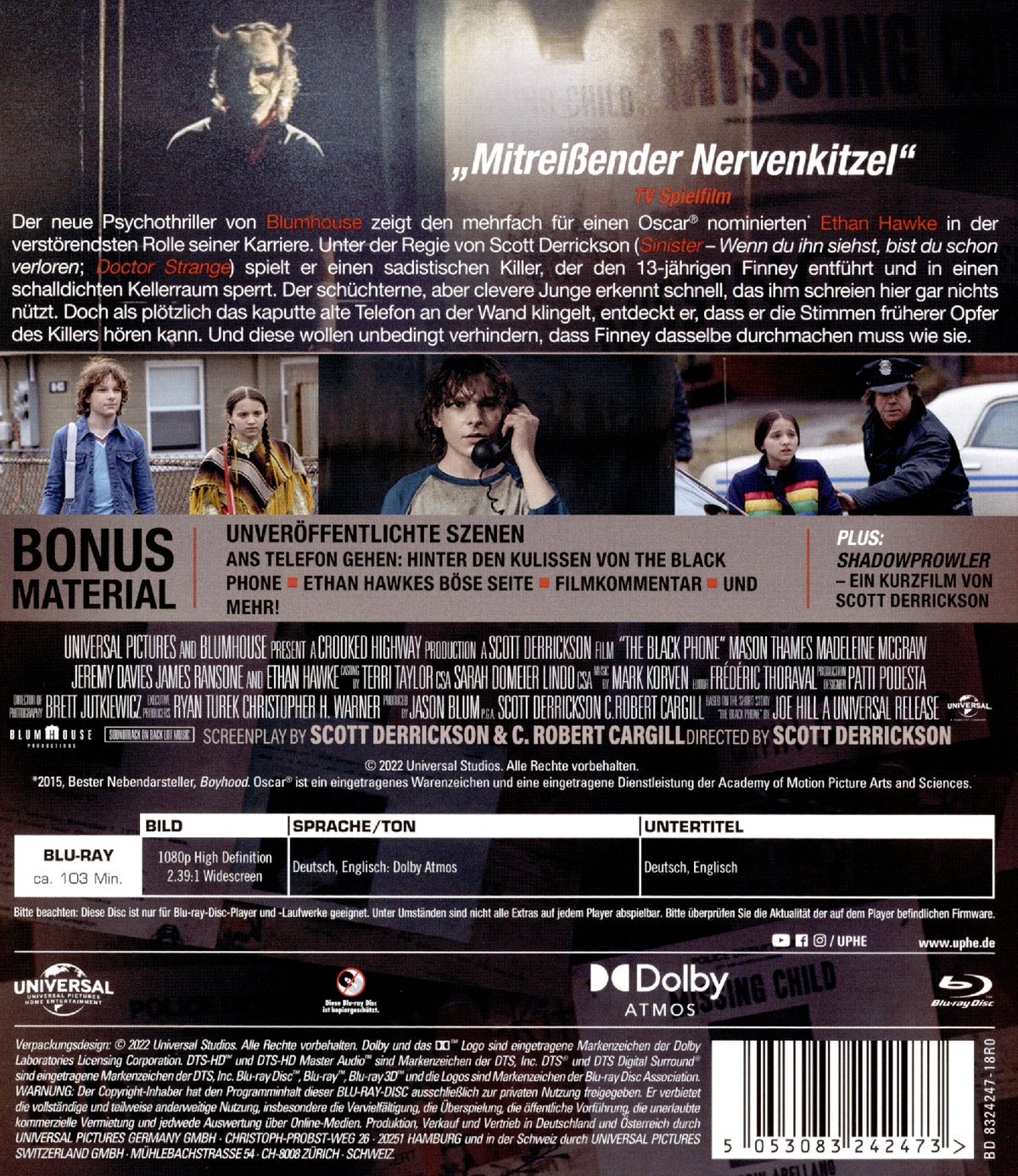 Der neue Psychothriller von Blumhouse zeigt den mehrfach für einen Oscar® nominierten Ethan Hawke in der verstörendsten Rolle seiner Karriere. Unter der Regie von Scott Derrickson (Sinister - Wenn du ihn siehst, bist du schon verloren; Doctor Strange) spielt er einen sadistischen Killer, der den 13-jährigen Finney entführt und in einen schalldichten Kellerraum sperrt. Der schüchterne, aber clevere Junge erkennt schnell, das ihm Schreien hier gar nichts nützt. Doch als plötzlich das kaputte alte Telefon an der Wand klingelt, entdeckt er, dass er die Stimmen früherer Opfer des Killers hören kann. Und diese wollen unbedingt verhindern, dass Finney dasselbe durchmacht wie sie.