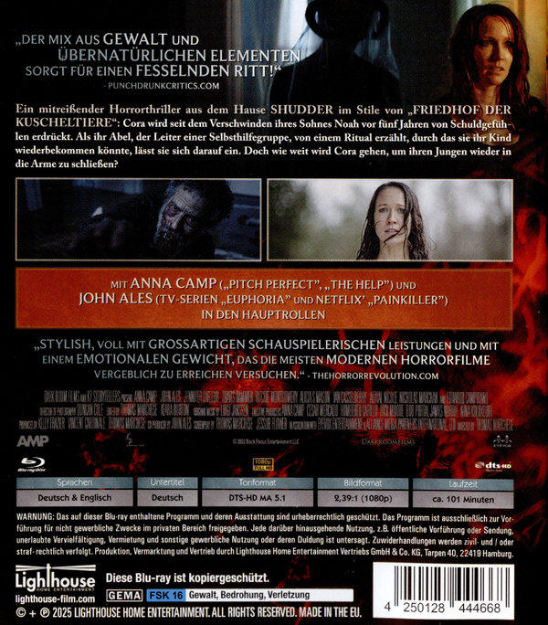 Ein mitreißender Horrorthriller im Stile von "FRIEDHOF DER KUSCHELTIERE": Cora wird seit dem Verschwinden ihres Sohnes Noah vor fünf Jahren von Schuldgefühlen erdrückt. Als ihr Abel, der Leiter einer Selbsthilfegruppe, von einem Ritual erzählt, durch das sie ihr Kind wiederbekommen könnte, lässt sie sich darauf ein. Doch wie weit wird Cora gehen, um ihren Jungen wieder in die Arme zu schließen?