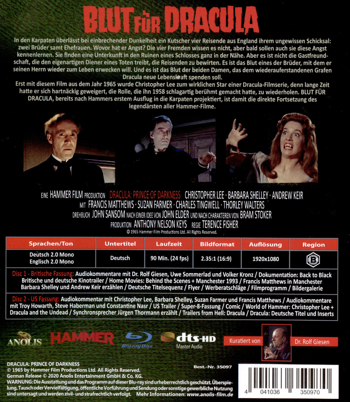 Disc 2 - US Fassung: Audiokommentare mit Christopher Lee, Barbara Shelley, Suzan Farmer und Francis Matthews; Audiokommentare mit Troy Howarth, Steve Haberman und Constantine Nasr; US Trailer; Super-8-Fassung; Comic; World of Hammer: Christopher Lee + Dracula and the Undead; Synchronsprecher Jürgen Thormann erzählt; Trailers from Hell: Dracula; Dracula: Titel und Inserts