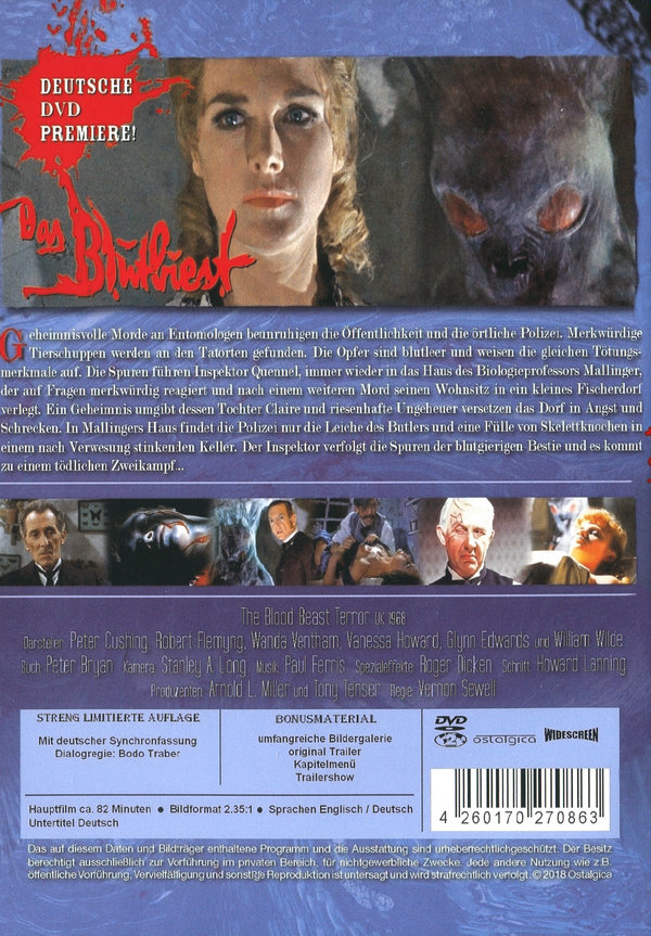verantwortlich ist. Bevor Inspektor Quennell die schrecklichen Zusammenhänge erkennt, taucht Dr. Mallinger zusammen mit seiner Tochter unter. Der Inspektor nimmt seine Spur auf, um dem grausamen Treiben ein Ende zu setzen. Ein herausragend agierender Peter Cushing in einem morbiden und stimmungsvollen Horrorfilm der legendären Tigon Studios aus Großbritannien.