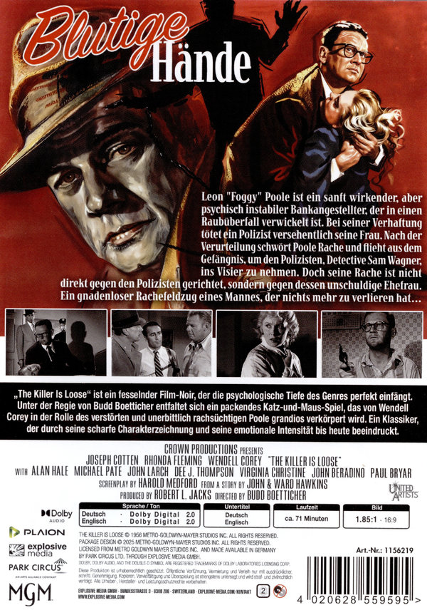 Blutige Hände (Originaltitel: The Killer is Loose) ist ein intensiver Film-Noir-Thriller unter der Regie von Budd Boetticher. Die Handlung dreht sich um Leon "Foggy" Poole, einen sanft wirkenden, aber psychisch instabilen Bankangestellten, der in einen Raubüberfall verwickelt ist. Bei seiner Verhaftung tötet ein Polizist versehentlich seine Frau. Nach seiner Verurteilung schwört Poole Rache und flieht aus dem Gefängnis, um den Polizisten, Detective Sam Wagner, ins Visier zu nehmen. Doch seine Rache ist nicht direkt gegen den Polizisten gerichtet, sondern gegen dessen unschuldige Ehefrau. Der Film packt durch seine düstere Atmosphäre und psychologische Spannung und zeigt eindrucksvoll den gnadenlosen Rachefeldzug eines Mannes, der nichts mehr zu verlieren hat.