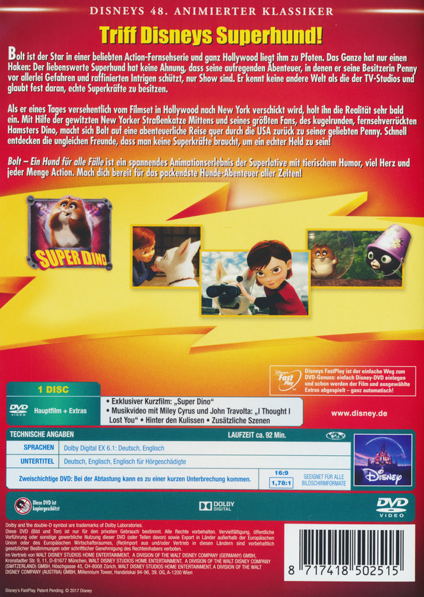 Das Leben ist ein einziges Abenteuer für Bolt. Der Superhund kämpft unermüdlich für das Gute, jagt wahnsinnige Schurken, stellt sich todesmutig jeder Gefahr und rettet am laufenden Band seine Besitzerin Penny. Jedenfalls solange die Kameras surren: Bolt ist der Star einer TV-Serie, und selbstverständlich hat er nur im Fernsehen übernatürliche Kräfte. Dumm ist nur, dass Bolt keine andere Welt als die des TV-Studios kennt - und fest daran glaubt, dass er tatsächlich Superkräfte hat.