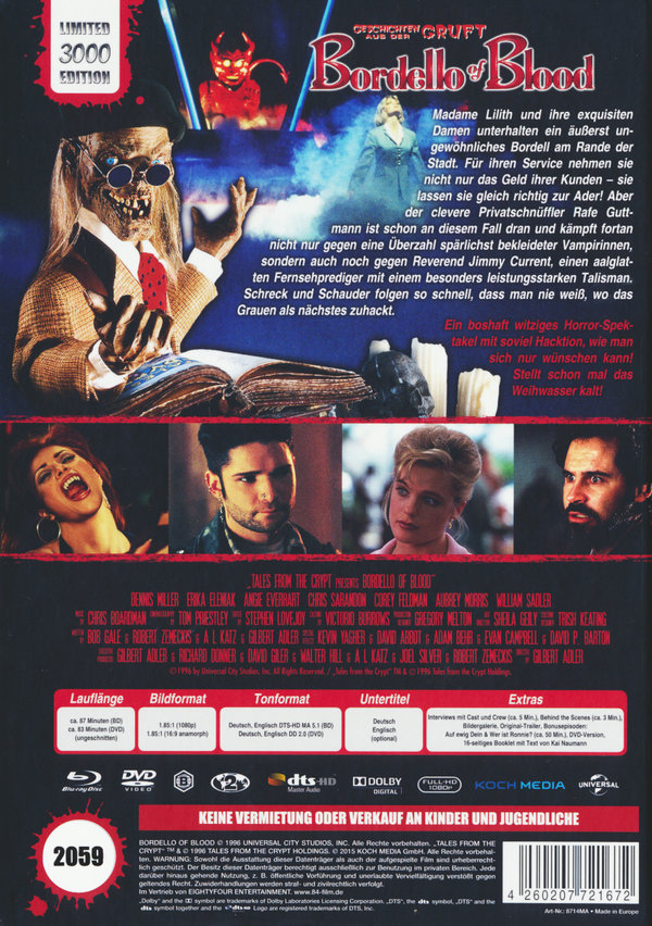 Viel nackte Haut, noch mehr Blut und mittendrin ein waschechtes Playboy-Model: Mit der längst schon legendären Horror-Comedy "Bordello Of Blood" wagten sich die "Tales From The Crypt" nach "Ritter der Dämonen" zum zweiten Mal auf die große Leinwand. Wo Playmate Erika Eleniak neben Ex-Model Angie Everhart die unbestreitbar hohen Gore-Schauwerte sogar noch in den Schatten stellen darf. Und zwar erstmals auch im schicken Steelbook, dessen Bonusmaterial ähnlich ausfällt, wie die Oberweiten der beteiligten Damen: üppig!
