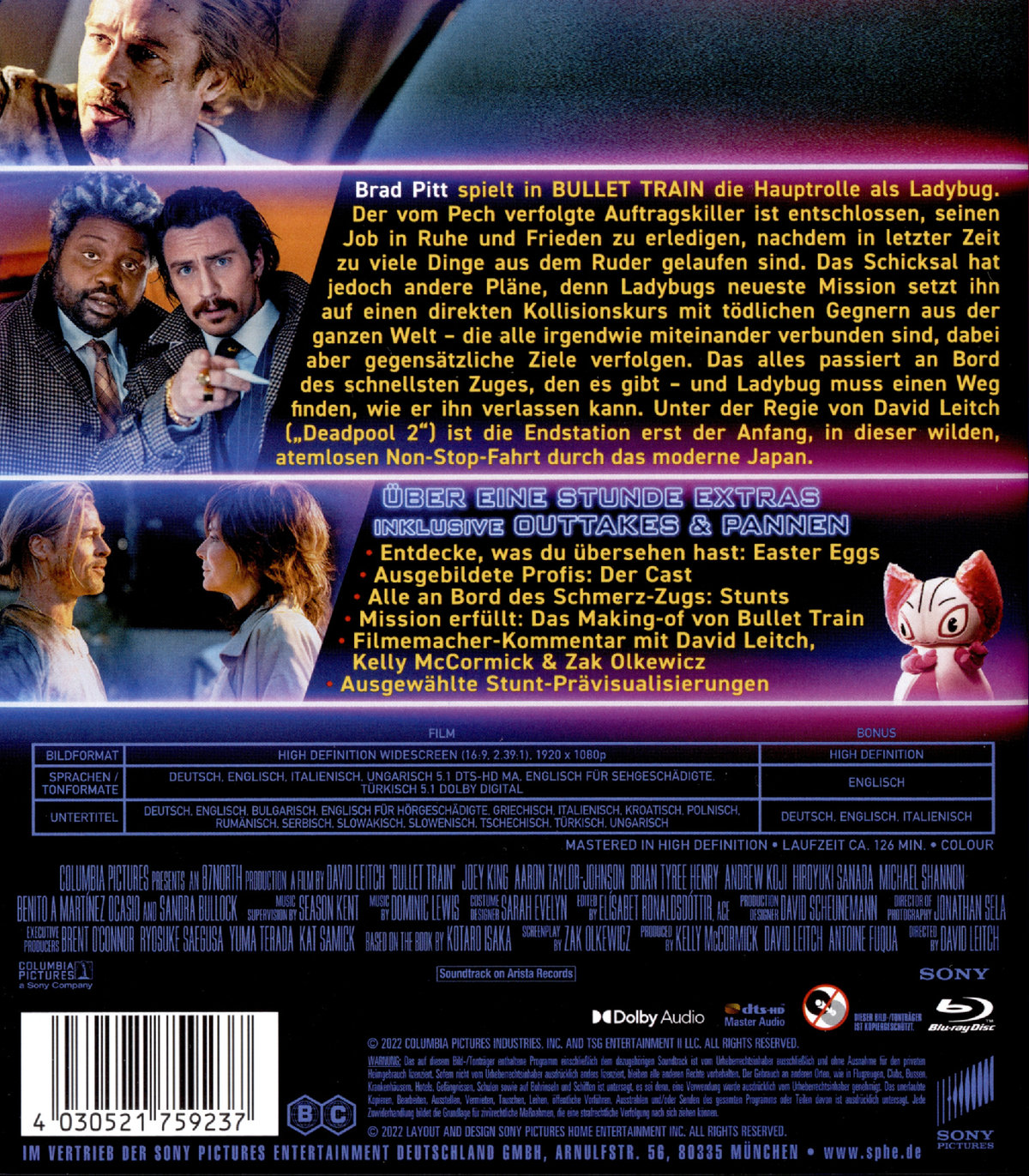 Brad Pitt spielt in BULLET TRAIN die Hauptrolle als Ladybug. Der vom Pech verfolgte Auftragskiller ist entschlossen, seinen Job in Ruhe und Frieden zu erledigen, nachdem in letzter Zeit zu viele Dinge aus dem Ruder gelaufen sind. Das Schicksal hat jedoch andere Pläne, denn Ladybugs neueste Mission setzt ihn auf einen direkten Kollisionskurs mit tödlichen Gegnern aus der ganzen Welt – die alle irgendwie miteinander verbunden sind, dabei aber gegensätzliche Ziele verfolgen. Das alles passiert an Bord des schnellsten Zuges, den es gibt - und Ladybug muss einen Weg finden, wie er ihn verlassen kann. Unter der Regie von David Leitch („Deadpool 2“) ist die Endstation erst der Anfang, in dieser wilden, atemlosen Non-Stop-Fahrt durch das moderne Japan.