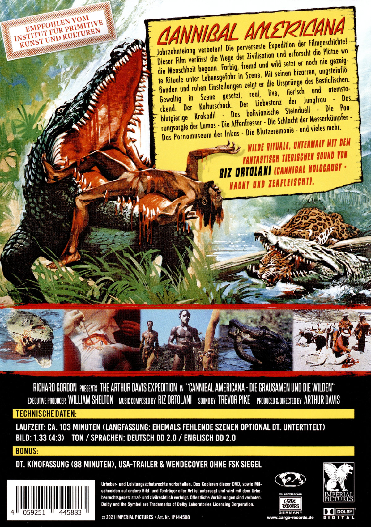 Der Liebestanz der Jungfrau -Das blutgierige Krokodil - Das bolivianische Steinduell - Die Paarungsorgie der Lamas - Die Affenfresser - Die Schlacht der Messerkämpfer - Das Pornomuseum der Inkas - Die Blutzeremonie - und vieles mehr. Wilde Rituale, untermalt mit dem fantastisch tierischen Sound von Riz Ortolani (Cannibal Holocaust - Nackt und zerfleischt).