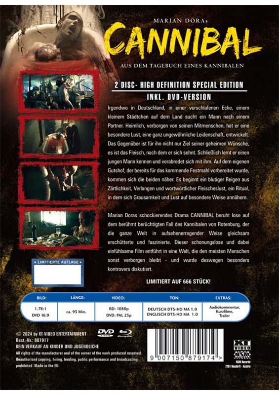 Marian Doras schockierendes Drama CANNIBAL beruht lose auf dem berühmt berüchtigten Fall des Kannibalen von Rotenburg, der die ganze Welt in aufsehenerregender Weise gleichsam erschütterte und faszinierte. Dieser schonungslose und dabei einfühlsame Film entführt in eine Welt, die den meisten Menschen sonst verborgen bleibt - und wurde deswegen besonders kontrovers diskutiert.