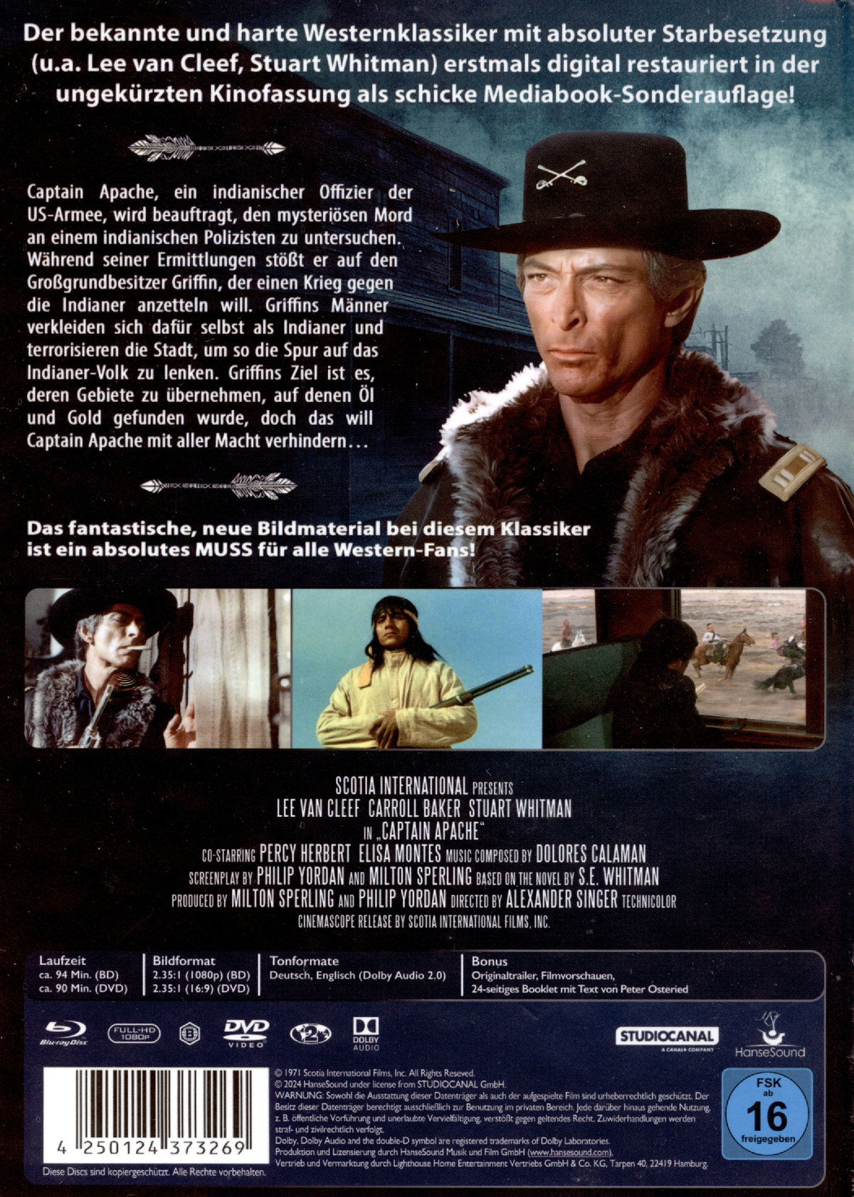 Der bekannte und harte Westernklassiker mit absoluter Starbesetzung (u.a. Lee van Cleef, Stuart Whitman) erstmals auf DVD & Blu-ray digital komplett restauriert in der ungekürzten Kinofassung mit fantastischem Bildmaterial! Captain Apache, ein indianischer Offizier der US-Armee, wird beauftragt, den mysteriösen Mord an einem indianischen Polizisten zu untersuchen. Während seiner Ermittlungen stößt er auf den Großgrundbesitzer Griffin, der einen Krieg gegen die Indianer anzetteln will. Griffins Männer verkleiden sich dafür selber als Indianer und terrorisieren die Stadt, um so die Spur auf das Indianer-Volk zu lenken. Griffins Ziel ist es, deren Gebiete zu übernehmen, auf denen Öl und Gold gefunden wurde, doch das will Captain Apache mit aller Macht verhindern…