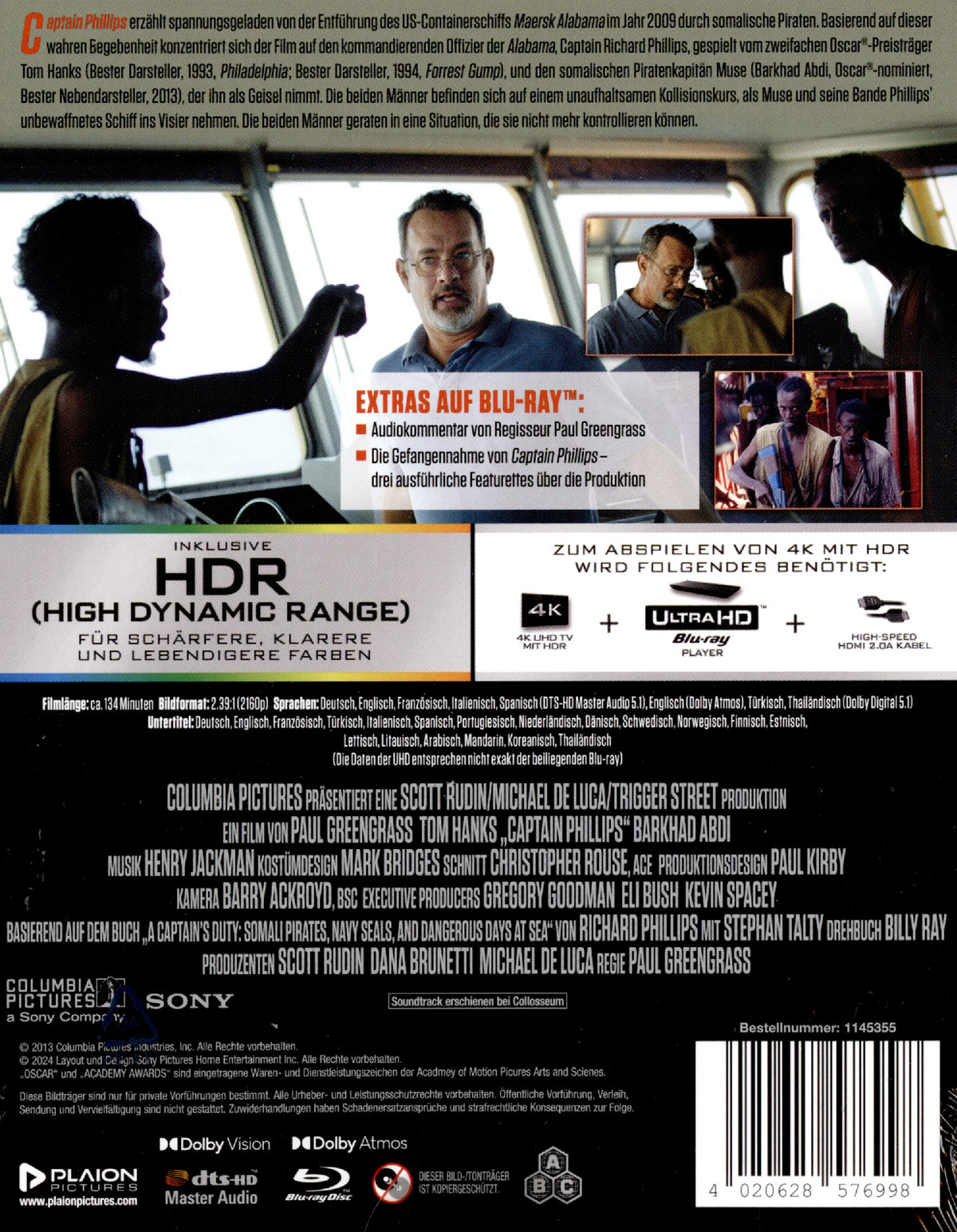 Im April des Jahres 2009 wird das US-amerikanische Container-Frachtschiff "MV Maersk Alabama" vor der Ostküste Somalias von Piraten gekapert. Es ist der erste Fall dieser Art für die Amerikaner seit über 200 Jahren. Um die eigene Crew vor einer Gefangennahme zu bewahren, bietet sich Captain Richard Phillips (Tom Hanks) den Piraten als Geisel an. Diese gehen auf das Angebot ein. Phillips muss sich vor allem mit dem Anführer Muse (Barkhad Abdi) auseinandersetzen, der sein Opfer immer wieder mit Gedanken zur Globalisierung und ihren Auswirkungen konfrontiert und auf diese Weise die eigene Piraterie verteidigt. Die Lage ist verfahren, Phillips versucht jedoch alles, um Zeit zu gewinnen. Im Hintergrund beginnen die Vorbereitungen für eine Befreiungsaktion. Zu dieser kommt es nach drei Tagen, allerdings geht sie nicht unblutig aus. (1 4K-UHD + 1 Blu-ray)
