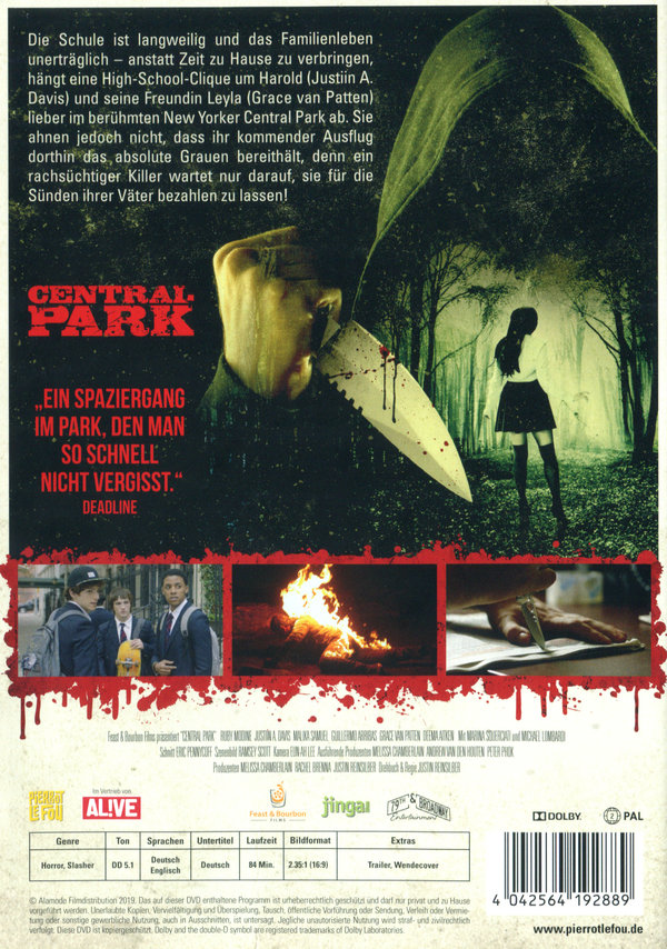 Die Schule ist langweilig und das Familienleben unerträglich - anstatt Zeit zu Hause zu verbringen, hängt eine High-School-Clique um Harold (Justiin A. Davis) und seine Freundin Leyla (Grace van Patten) lieber im berühmten New Yorker Central Park ab. Sie ahnen jedoch nicht, dass ihr kommender Ausflug dorthin das absolute Grauen bereithält, denn ein rachsüchtiger Killer wartet nur darauf, sie für die Sünden ihrer Väter bezahlen zu lassen! "Central Park", das Regie-Erstlingswerk des Schauspielers Justin Reinsilber, lässt das Herz von Fans von Slasher-Filmen wie "Halloween" oder "Freitag, der 13." höherschlagen. Blutig, angsteinflößend und mit einem brutalen Killer, der keine Gnade kennt.