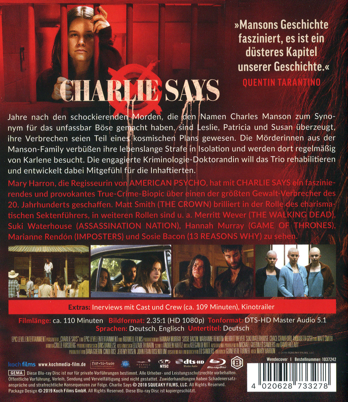 Mary Harron, die Regisseurin von AMERICAN PSYCHO, hat mit CHARLIE SAYS ein in Rückblenden erzähltes, faszinierendes und provokantes True Crime-Biopic über einen der größten Gewalt-Verbrecher des 20. Jahrhunderts geschaffen. Matt Smith (THE CROWN) brilliert in der Rolle des charismatischen Sektenführers Manson, in weiteren Rollen sind u. a. die zweifache Emmy-Preisträgerin Merritt Wever (THE WALKING DEAD), Ex-Model Suki Waterhouse (ASSASSINATION NATION), Hannah Murray (GAME OF THRONES), Marianne Rendón (IMPOSTERS) und Sosie Bacon (13 REASONS WHY) zu sehen.