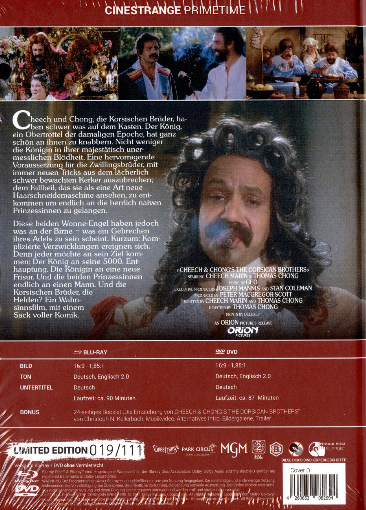 Cheech und Chong, die Korsischen Brüder, haben schwer was auf dem Kasten. Der König, ein Obertrottel der damaligen Epoche, hat ganz schön an ihnen zu knabbern. Nicht weniger die Königin in ihrer majestätisch unermesslichen Blödheit. Eine hervorragende Voraussetzung für die Zwillingsbrüder, mit immer neuen Tricks aus dem lächerlich schwer bewachten Kerker auszubrechen; dem Fallbeil, das sie als eine Art neue Haarschneidemaschine ansehen, zu entkommen um endlich an die herrlich naiven Prinzessinnen zu gelangen. Diese beiden Wonne-Engel haben jedoch was an der Birne – was ein Gebrechen ihres Adels zu sein scheint. Kurzum: Komplizierte Verzwicklungen ereignen sich. Denn jeder möchte an sein Ziel kommen: Der König an seine 5000. Enthauptung. Die Königin an eine neue Frisur. Und die beiden Prinzessinnen endlich an einen Mann. Und die Korsischen Brüder, die Helden? Ein Wahnsinnsfilm, mit einem Sack voller Komik.