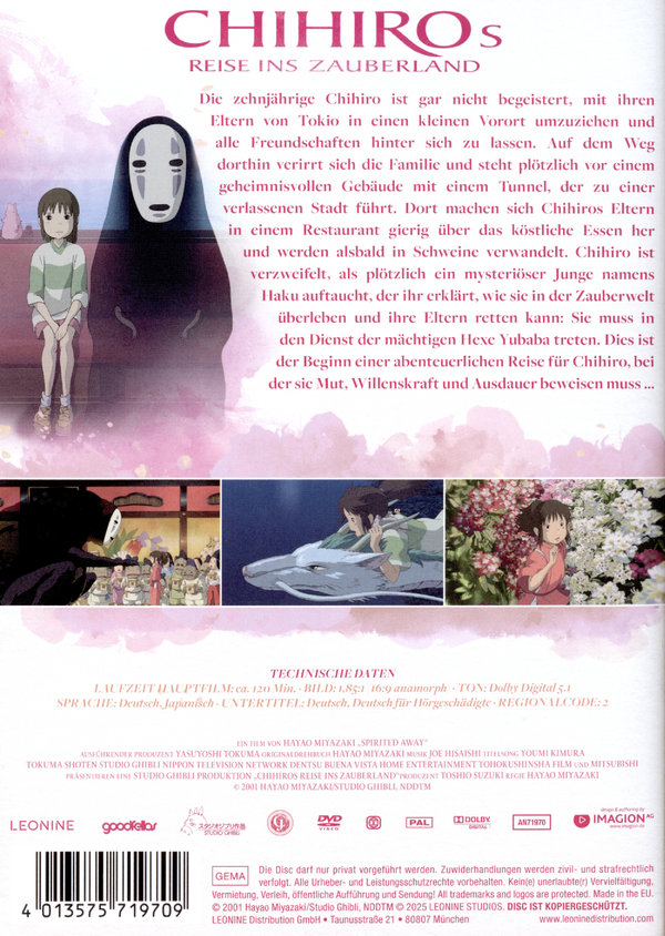 Sie kommen in eine verlassene Stadt und finden ein leeres Restaurant, wo Chihiros Eltern sich gierig auf das Essen stürzen - und in Schweine verwandelt werden. Plötzlich erscheint ein geheimnisvoller Junge namens Haku, der Chihiro erklärt, dass es nur eine Möglichkeit gibt, ihre verzauberten Eltern zu retten: Sie muss in den Dienst der bösen Hexe Yubaba treten, die nicht nur die Zauberwelt von Aburaya beherrscht. Chihiro stellt sich dieser Herausforderung und macht sich auf eine Reise, auf der sie ungeahnten Mut, eine bisher nicht gekannte Willenskraft und Ausdauer beweisen muss ...