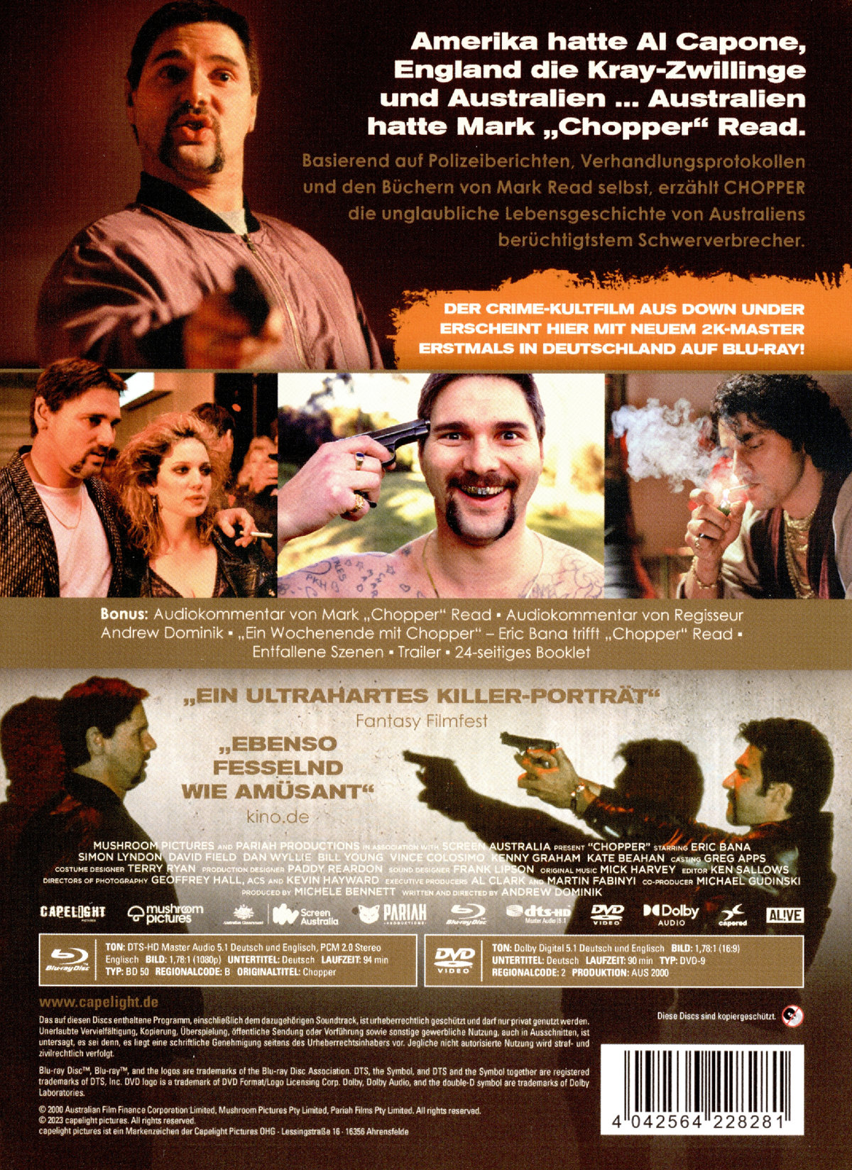 2-Disc Limited Collector's Edition im Mediabook mit dem Film auf Blu-ray und DVD sowie 24-seitigem Booklet; Bonus: Audiokommentar von Mark Brandon "Chopper" Read; Audiokommentar von Regisseur Andrew Dominik; "Ein Wochenende mit Chopper" – Eric Bana trifft "Chopper" Read; Entfallene Szenen; Trailer
