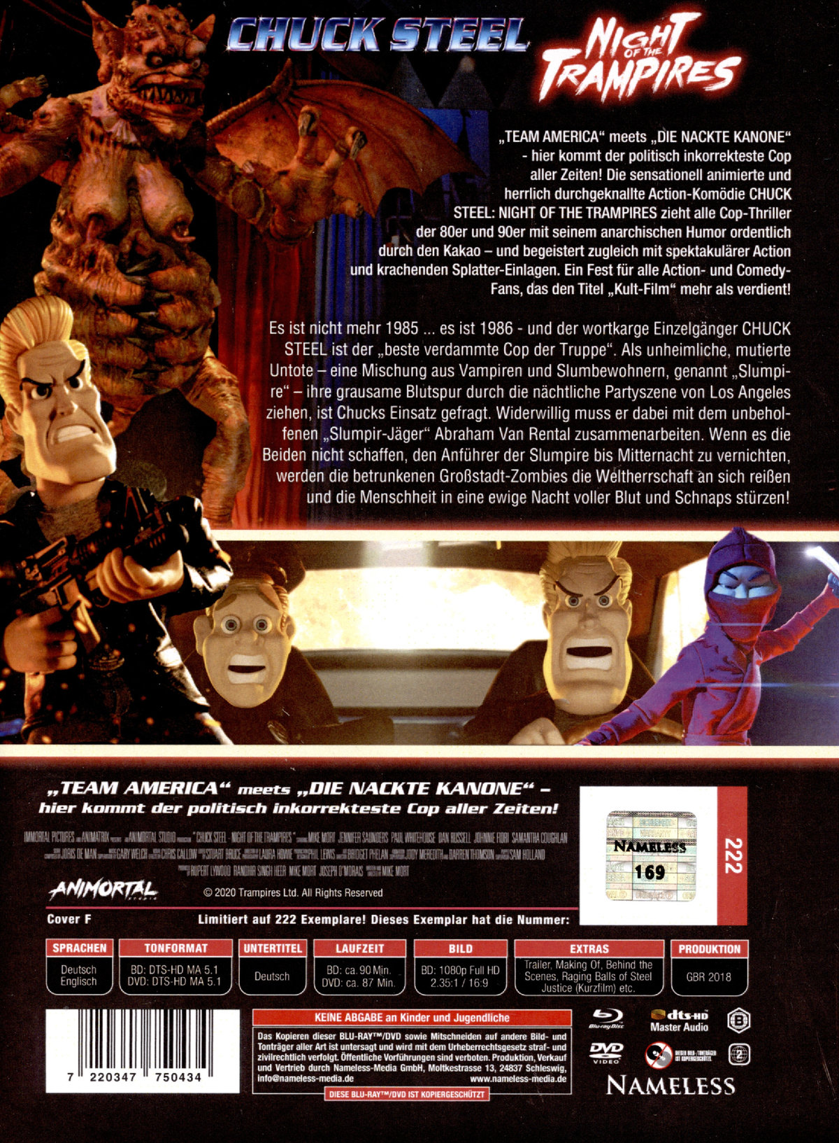 „TEAM AMERICA“ meets „DIE NACKTE KANONE“ - hier kommt der politisch inkorrekteste Cop aller Zeiten! Die sensationell animierte und herrlich durchgeknallte Action-Komödie CHUCK STEEL: NIGHT OF THE TRAMPIRES zieht alle Cop-Thriller der 80er und 90er mit seinem anarchischen Humor ordentlich durch den Kakao – und begeistert zugleich mit spektakulärer Action und krachenden Splatter-Einlagen. Ein Fest für alle Action- und Comedy-Fans, das den Titel „Kult-Film“ mehr als verdient! Es ist nicht mehr 1985 ... es ist 1986 - und der wortkarge Einzelgänger CHUCK STEEL ist der „beste verdammte Cop der Truppe“. Als unheimliche, mutierte Untote – eine Mischung aus Vampiren und Slumbewohnern, genannt „Slumpire“ – ihre grausame Blutspur durch die nächtliche Partyszene von Los Angeles ziehen, ist Chucks Einsatz gefragt. Widerwillig muss er dabei mit dem unbeholfenen „Slumpir-Jäger“ Abraham Van Rental zusammenarbeiten. Wenn es die Beiden nicht schaffen, den Anführer der Slumpire bis Mitternacht zu vernichten, werden die betrunkenen Großstadt-Zombies die Weltherrschaft an sich reißen und die Menschheit in eine ewige Nacht voller Blut und Schnaps stürzen!